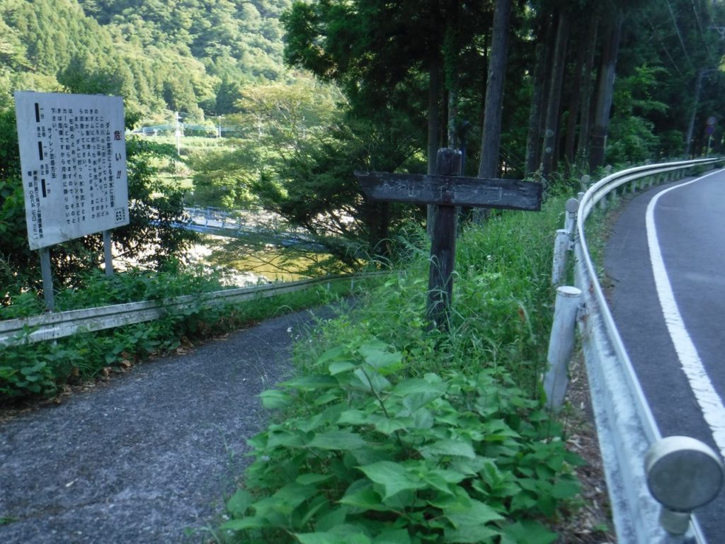 河内川の釣橋を渡り、農家の裏庭を通り不老山の登山道を少し登り沢に降りる。