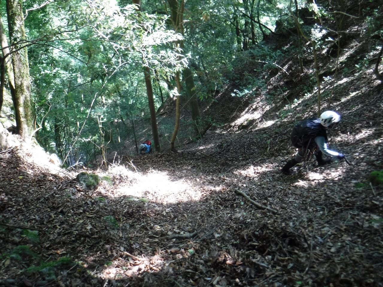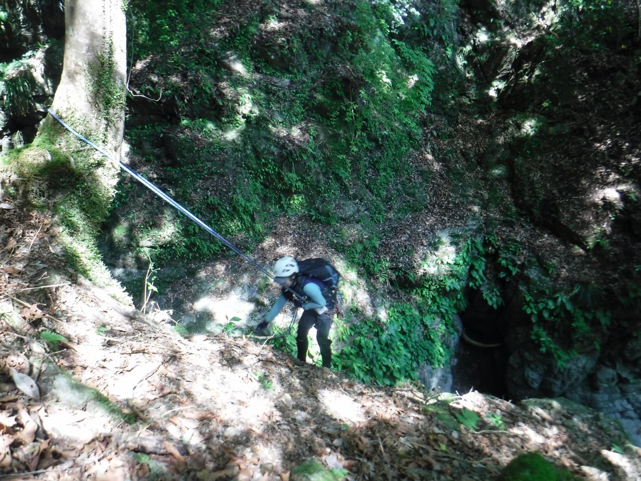 急な尾根状を降り、最後懸垂下降で沢に降りる。