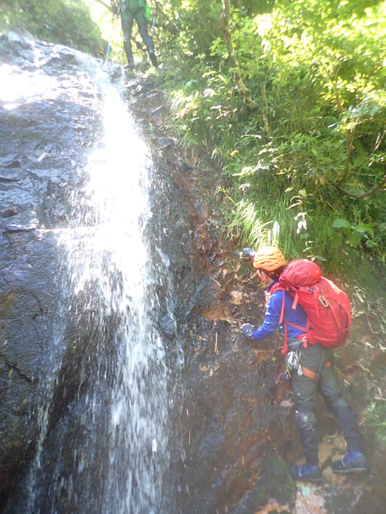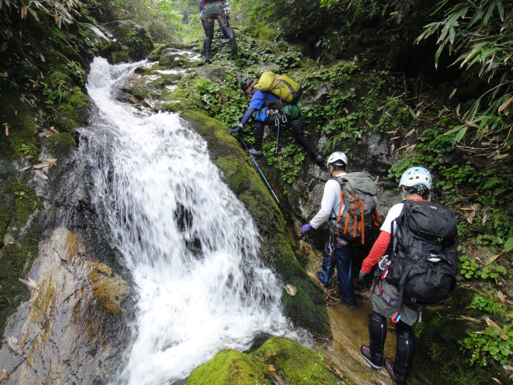 そろそろ50m大滝かな、と思ったその直前にある5-6mほどの滝が見た目より悪かった。左岸水際を登るがヌメリもあり、大事をとってロープを使った。