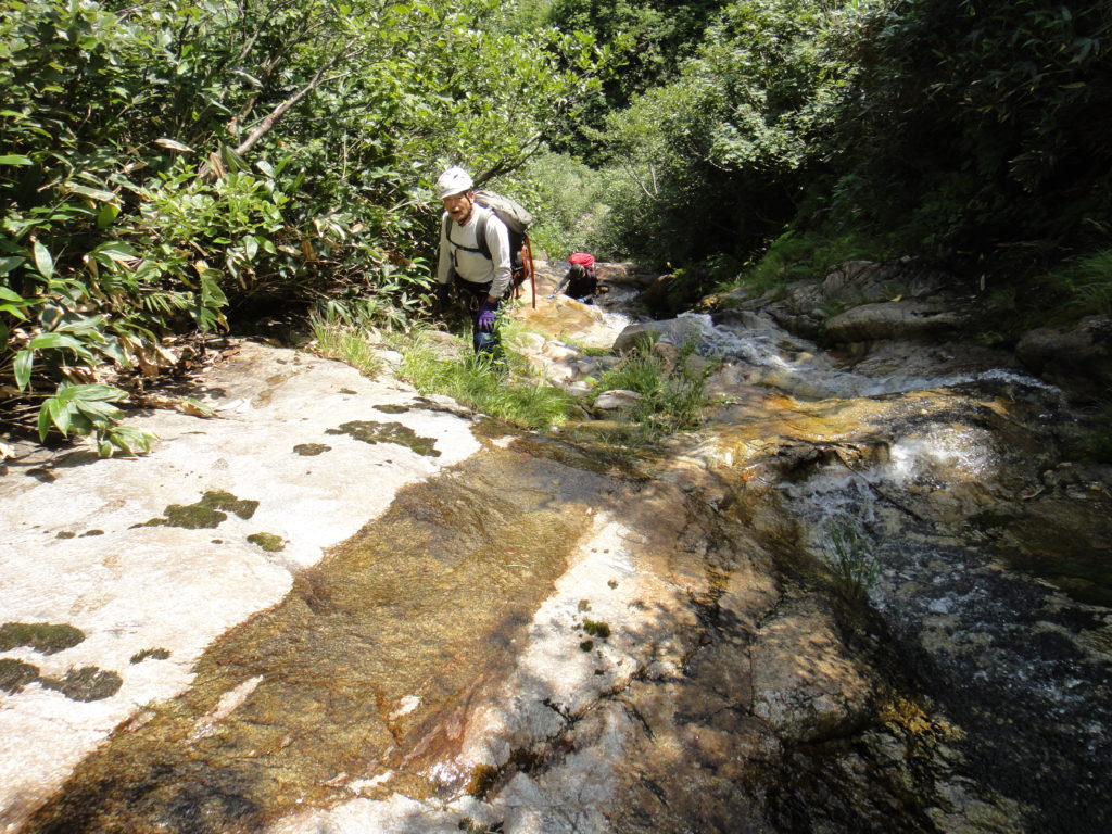 ようやく合流し、準備をして入渓したのは7時45分。いよいよ始まりました。ここ数年は泊まりでの沢登りはしていなかったので、楽しみと重荷の不安がありました。
