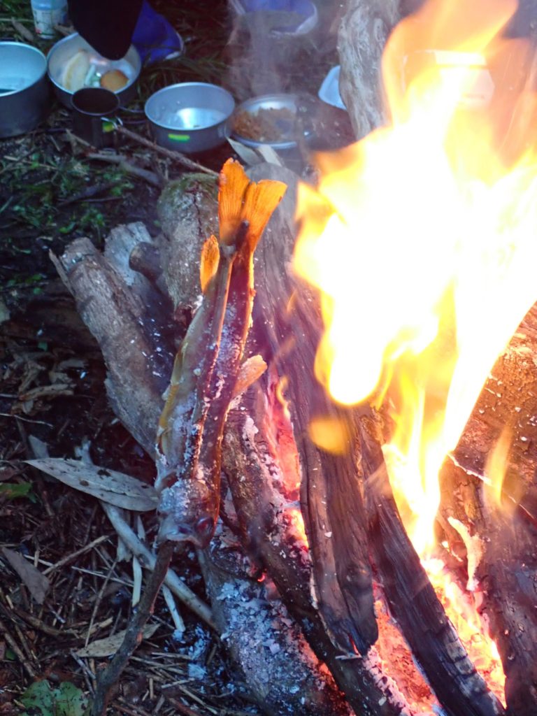 焚火での塩焼きはサイコーにウマイ!イワナパーティには出来なかったけど、沢はイイなぁ~、と思える瞬間であります。