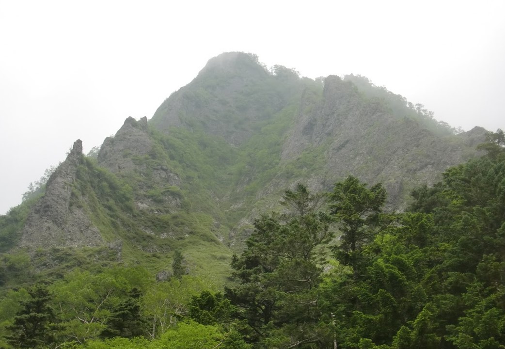 ガスが去来して不気味な雰囲気。左:第一岩稜、右:第二岩稜。(表紙の写真)