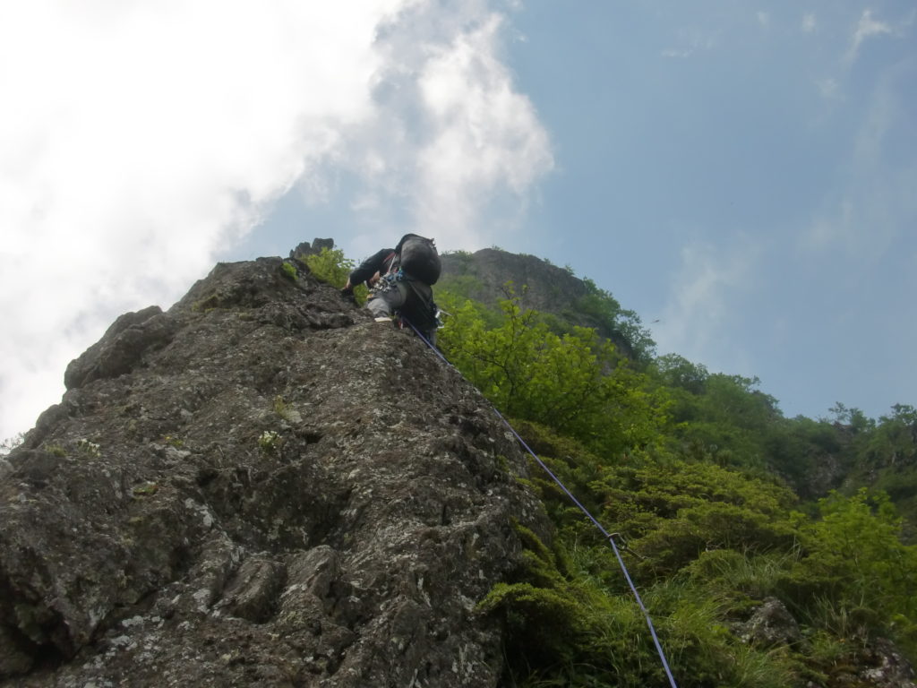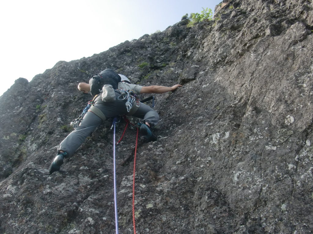 5p目、40m。フェースから岩稜。今回、敗退用のボルトやら草付用のイボイボやらを満載して臨んだが、このピッチにはまだ生きているボルトラダーがあって安堵半分、拍子抜け半分。でもおかげで快適なフリーが楽しめた。出だしは5.8くらい?