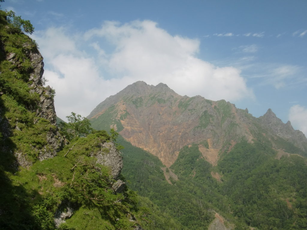 ここから草付のはげ落ちた岩場をトラバースすれば15mくらいで稜上のコルへ出られそうだが、見上げる壁は藪に覆われていてあんまり快適そうじゃない。だったら先に進むことにして、目の前の側稜を登る。