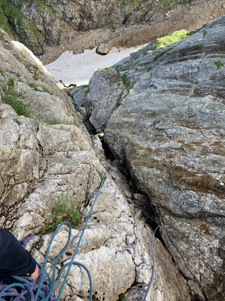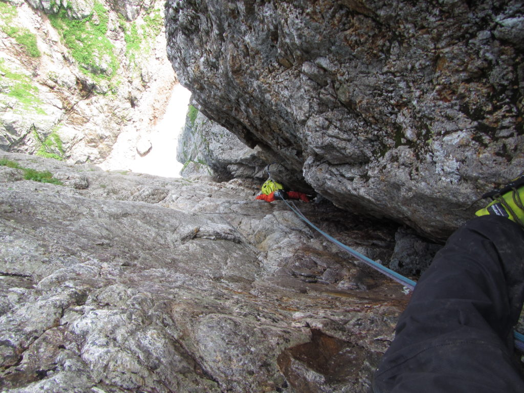 もっと進めたが,ハーケンが近くに2枚あったし2P目のルンゼらしいものがあるし