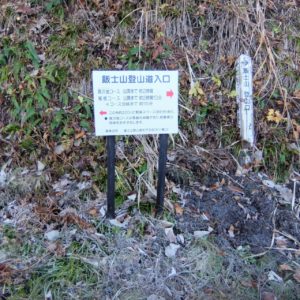 駐車場から来た道を少し戻ると登山口。看板有り。