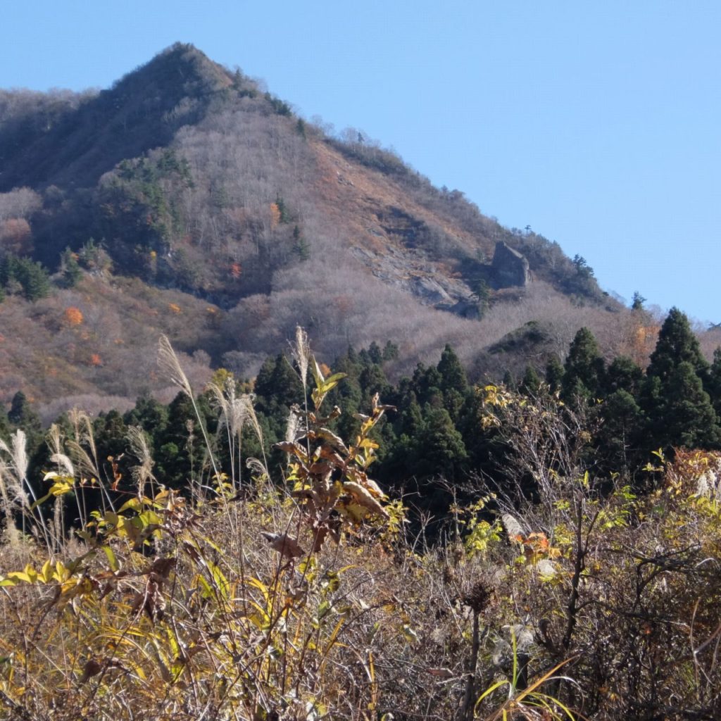 駐車場から望む、飯士山、負欠岩。