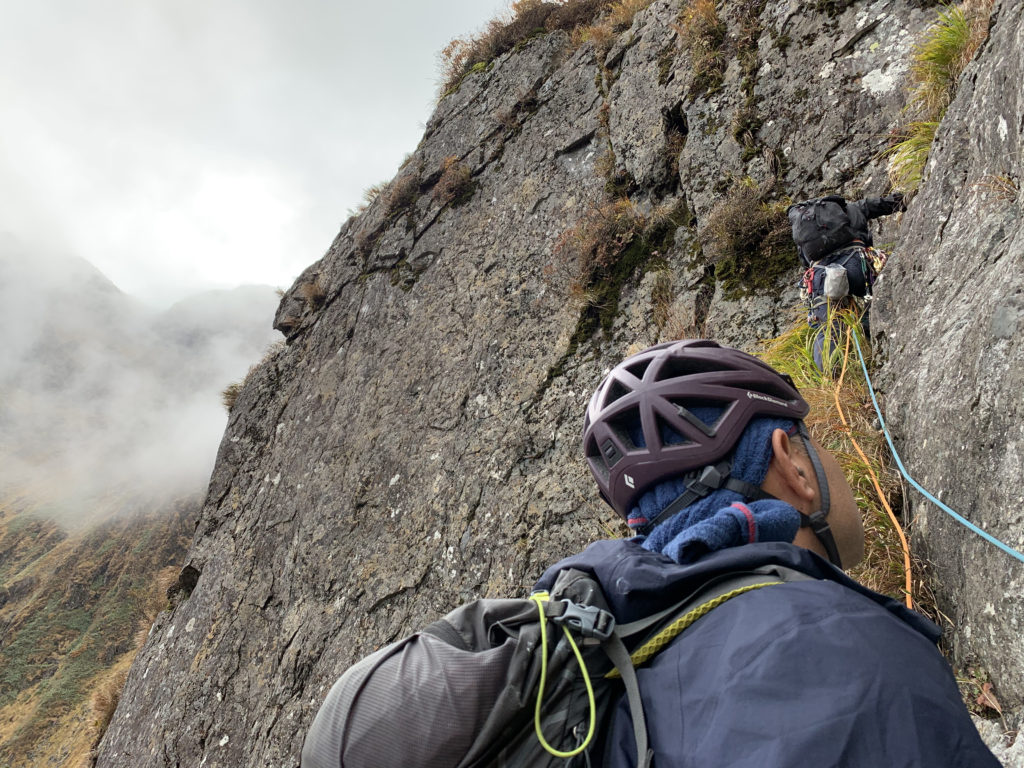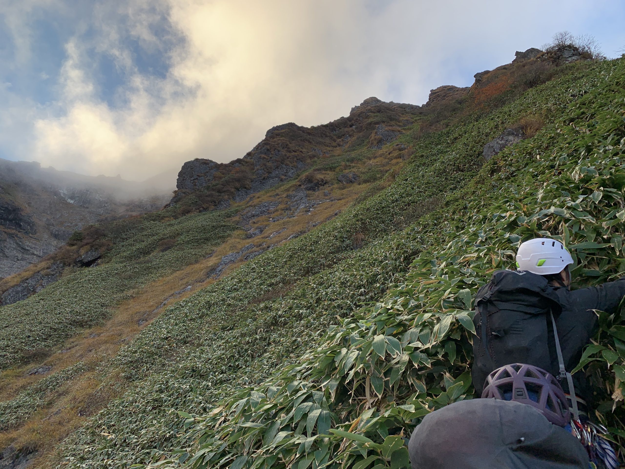 濡れた気持ち悪いルンゼを渡って笹薮に乗る