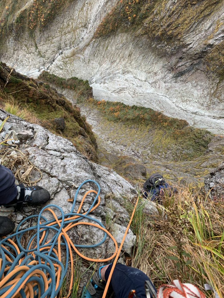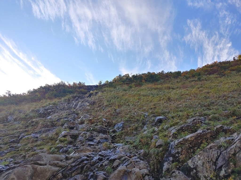 途中5ルンゼの頭でロープを出し、国境稜線直下はふさふさの笹薮でハイになった