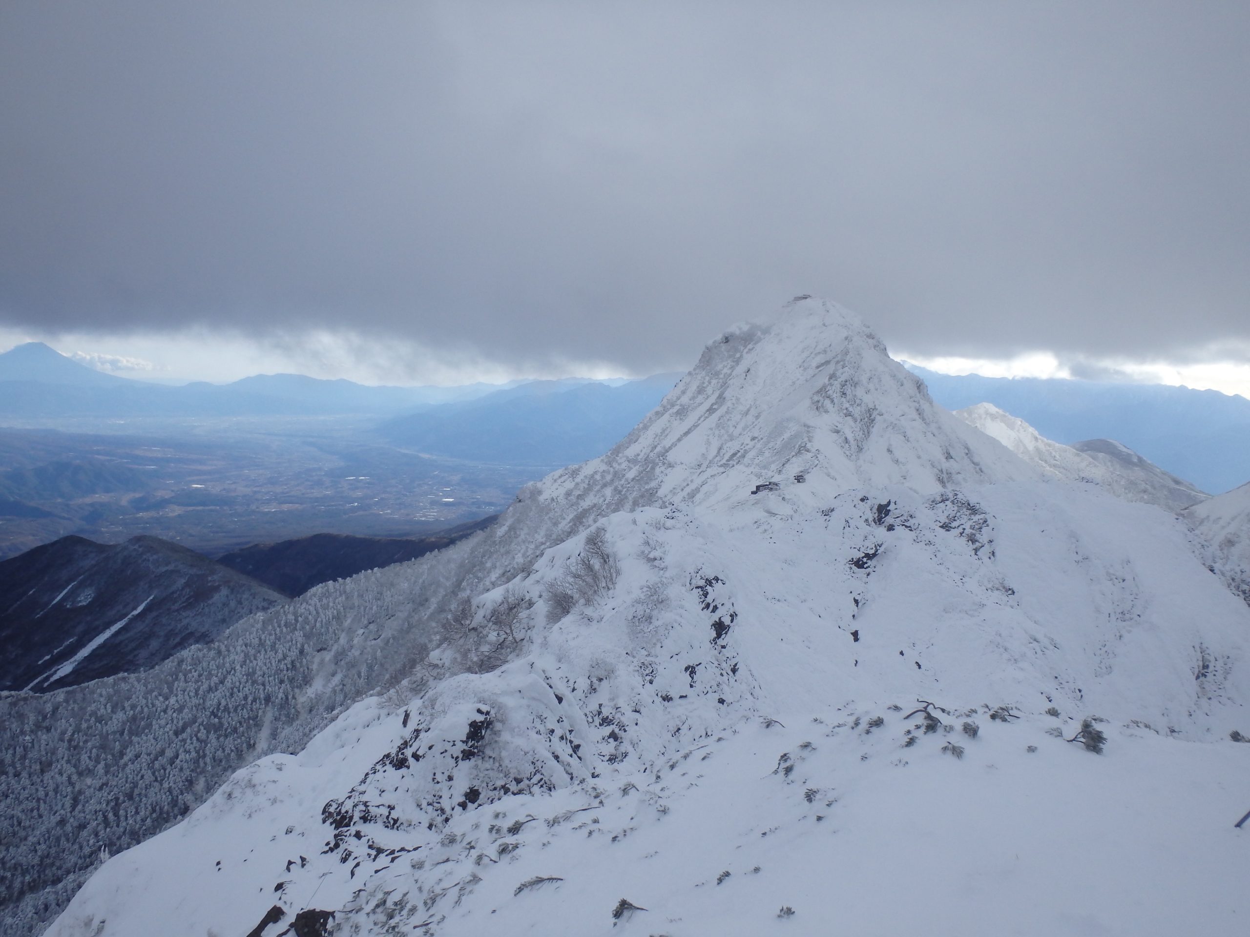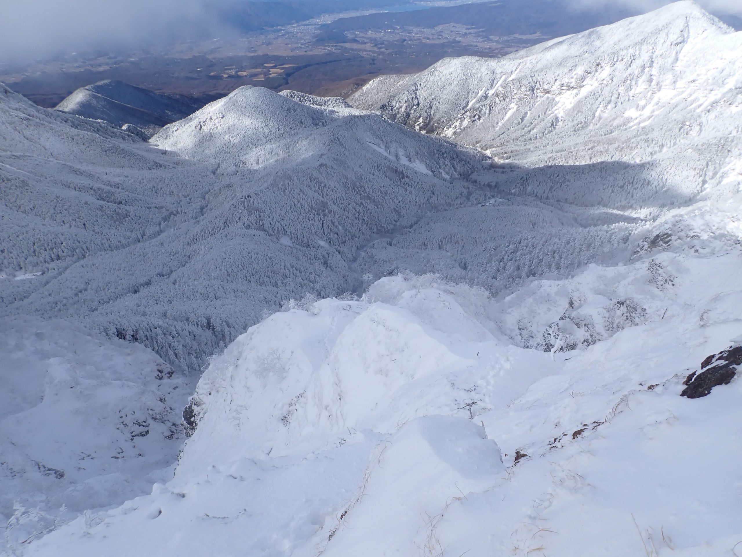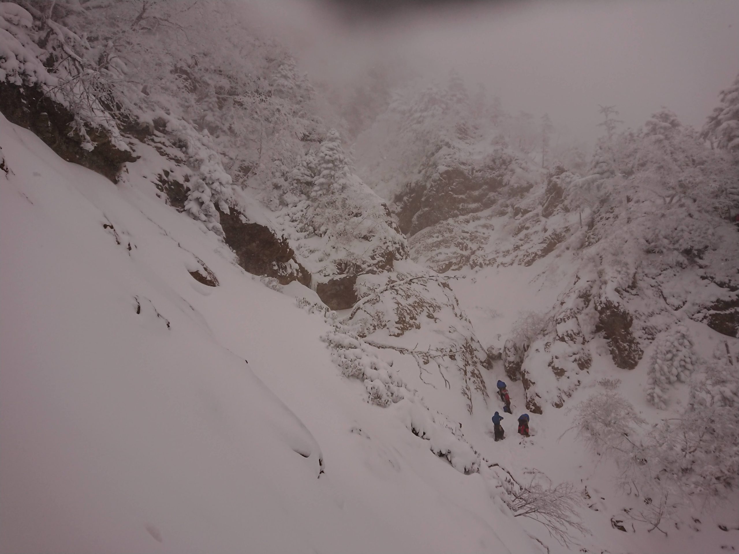 ルートは当初、日ノ岳稜の予定だったが諸事情につき石尊稜に転進。取り付きへは三叉峰ルンゼ方面からやや急峻な斜面を詰める。