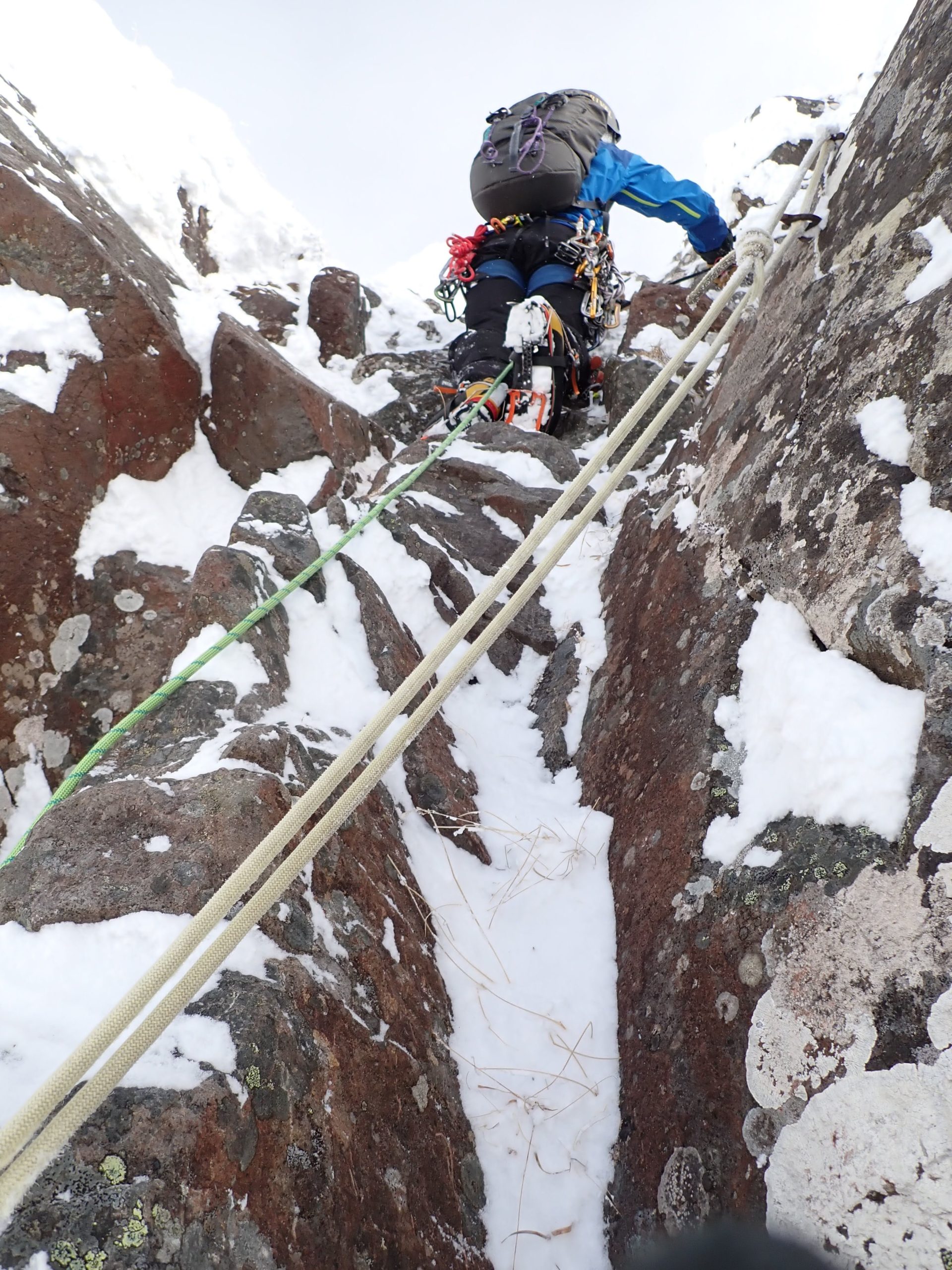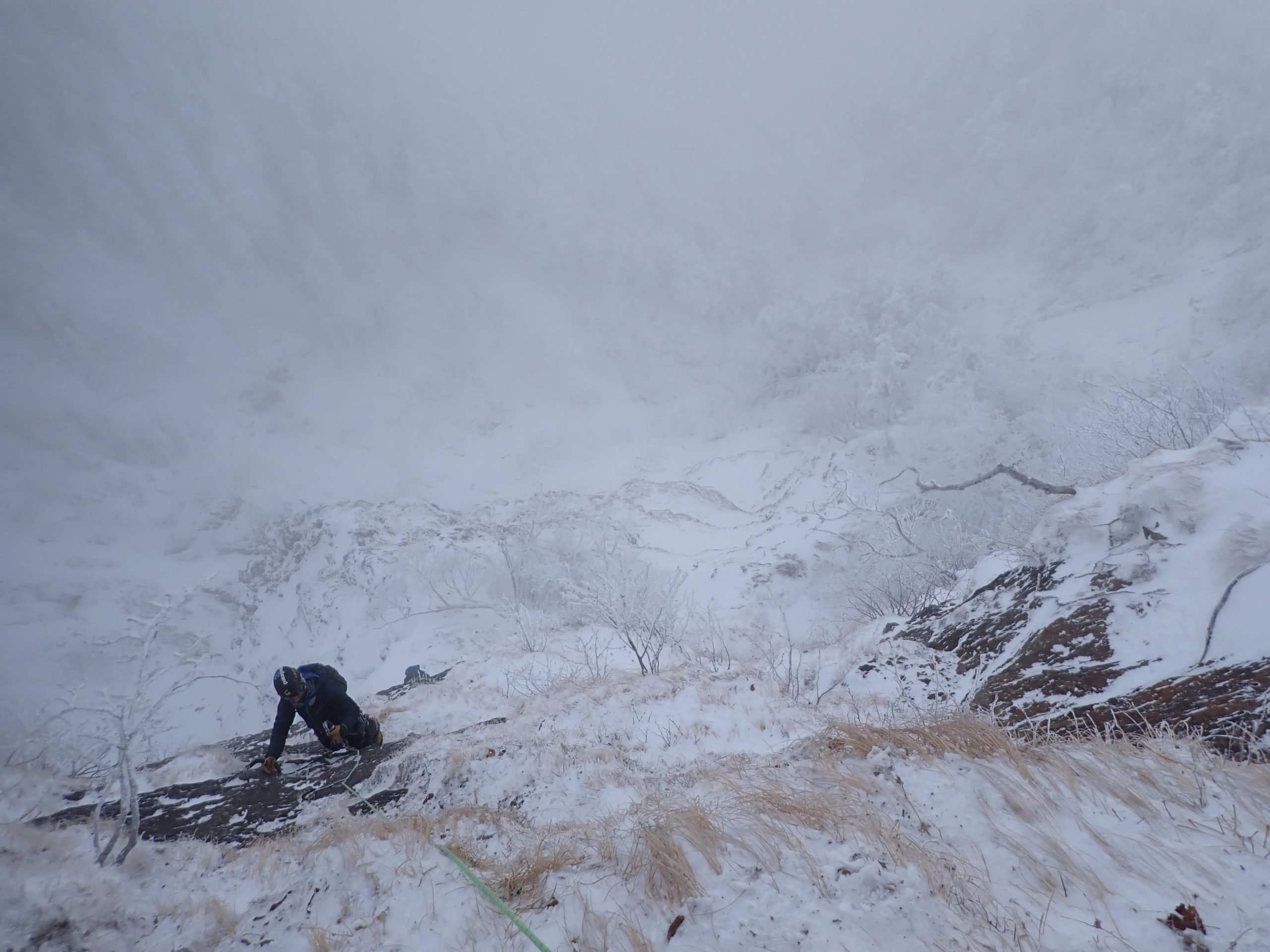 1ピッチ目は宮崎さんリード。正面のフェースを登る。ビレイ中には常時10メートル強の風が吹きっさらしになり辛い。。某民間気象会社によれば赤岳鉱泉の最高気温が−10℃だったから体感は−30℃くらいまで行ったでしょうか。冬山シーズン1発目にして本気の寒さを味わった。