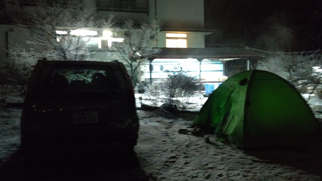 さて、そろそろ予約していたキャンプ場のチェックイン時刻も近くなり、スーパーで買い出し。一日中降り積もる雪の中、テント設営し早々に宴会開始!因みにここは宿泊棟・お風呂も備える「蓼の花オートキャンプ場」。ゴミ捨て・水場・トイレも完備です。