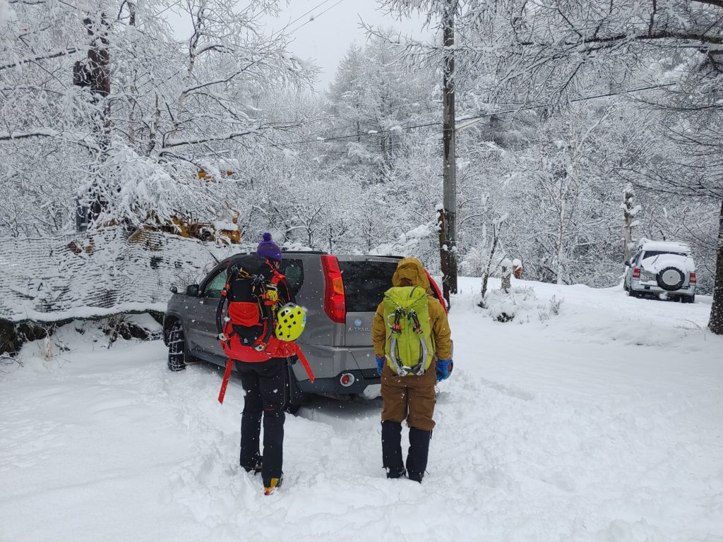 スタッドレスを履いたHARUSSAN号で順調に進むが、鉱泉に向かう二俣のあたりのアイスバーンに捕まり走行不能に。上からも天狗岳に行こうとしていた別パーティーが車で降りてくる。昨日の気温が高かったせいで、溶けた雪が固まったせいでトゥルトゥルなのだとの事。
