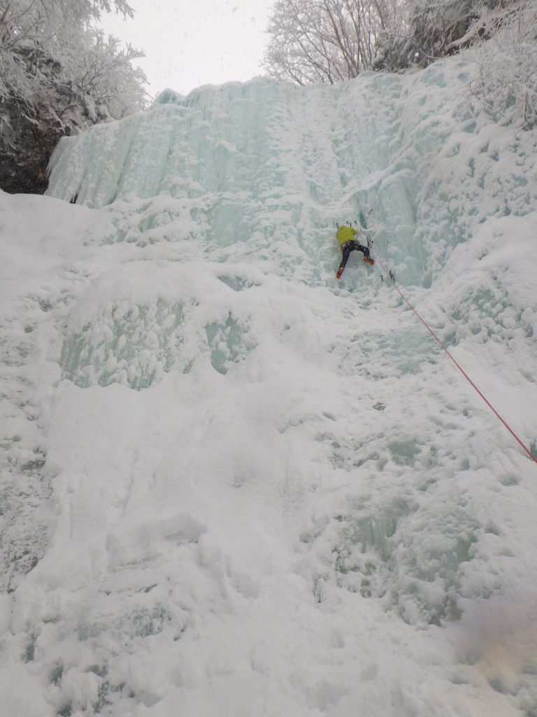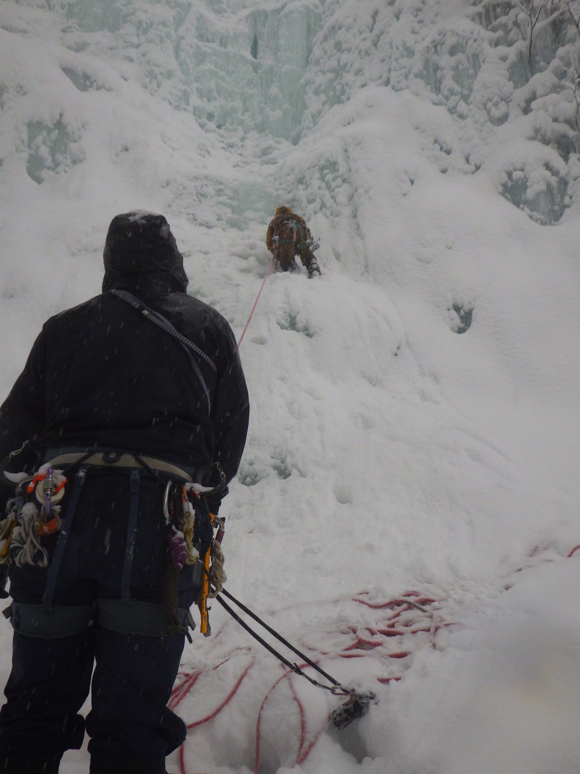 結果は深い雪に何度もスタック。四輪にチェーンをばっちし履いてガンガン登る夏沢鉱泉の送迎車を尻目に今日も敗退。八ヶ岳の南沢大滝へ転進。13:00頃から2時間位ですがアイスクライミングを行い終了となりました。雪にやられた二日間でしたが、いつでも前向き明るいメンバーのお陰で楽しい時間を過ごせました。私も昨年の凍傷以来、約1年ぶりの雪山でしたが、指の調子も悪くなく一安心できました。