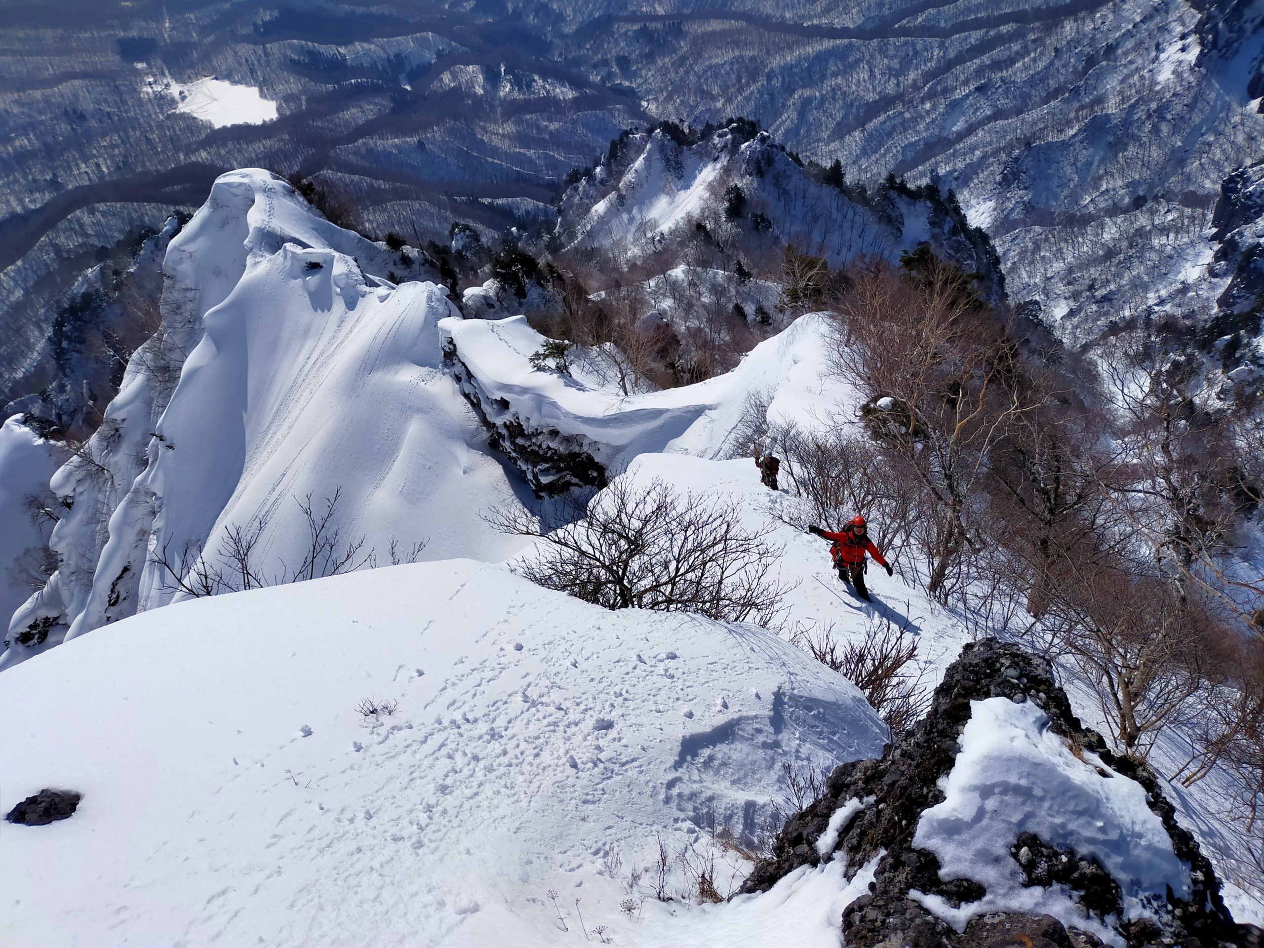 途中から八ヶ岳東面を思い起こすような痩せ尾根となり、アイゼンに付け替えざるを得ないため、時折檄ラッセル混じりとなる。