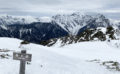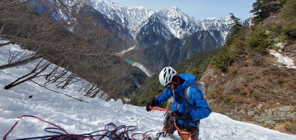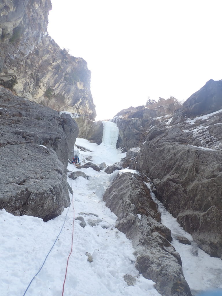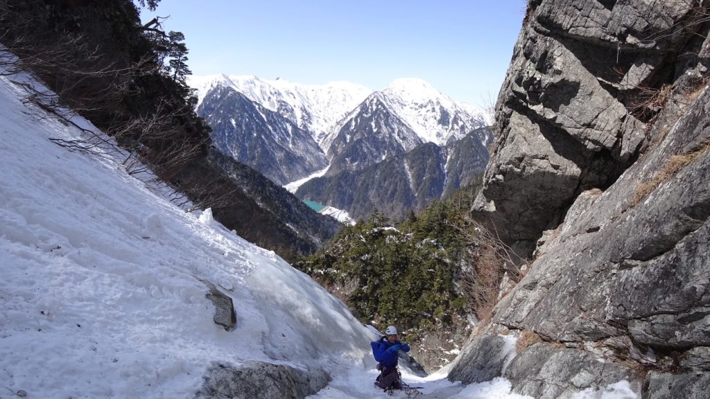 F2を超えて時間を見てみるとなんと12時過ぎ。14時までには下降開始しようと決め、どうしても上まで行きたかったのでそこからがんがんロープを伸ばしました。3P目は、簡単な小滝を超えてアイス交じりの雪壁。息を上げながら後ろを振り返ると、高瀬ダムと北アルプスが見えテンション上がります。これが見たかったー!写真は終了点を上から。