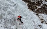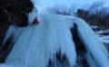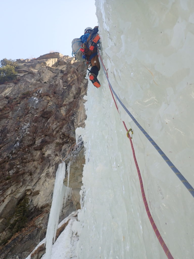 最初私がリードで行くも、バーチカル部分までくると遠くでも見るよりも迫力が数段増した。右半分は下に亀裂が入っていて、とれるのは左の1ラインのみ。そこは「つらら集まりました」という感じでアックスで叩くとからーんとつららが落ち絶望。下を見つめてMくんにチェンジです。アイスは久しぶりらしいけど、ノーテンで超えてくれました。