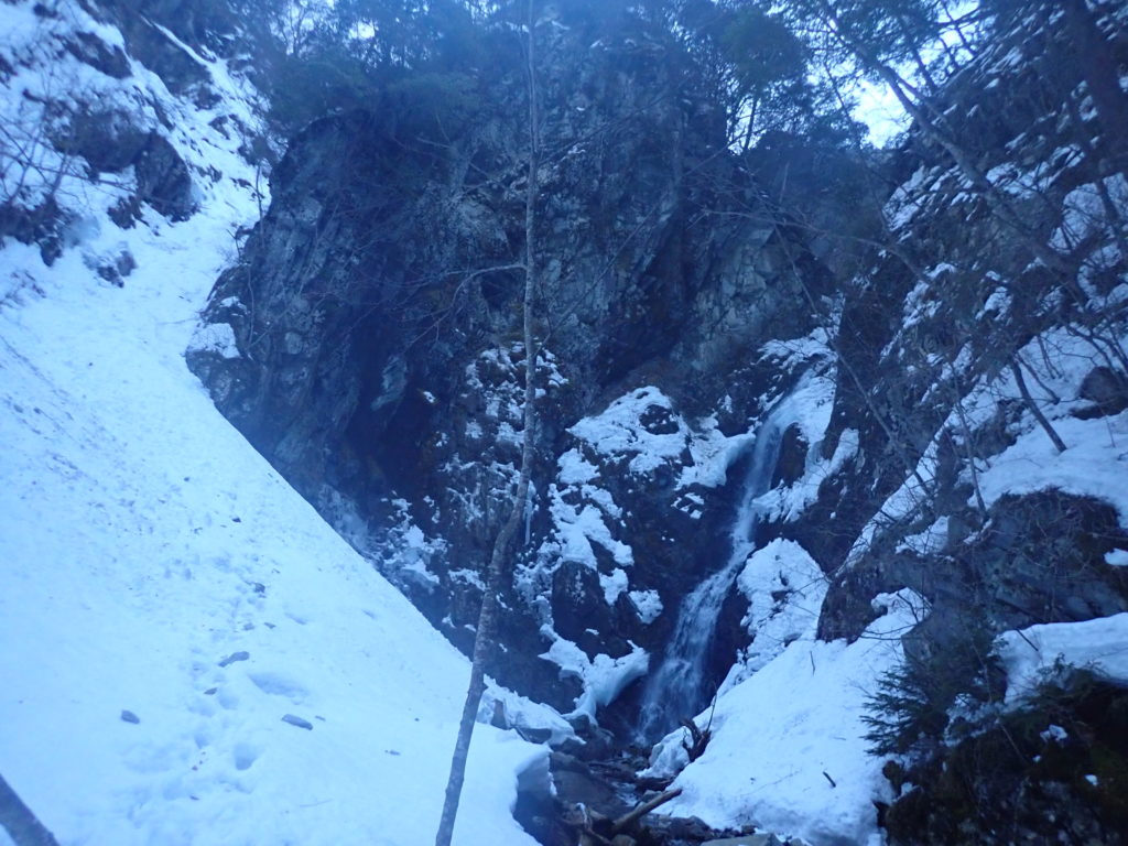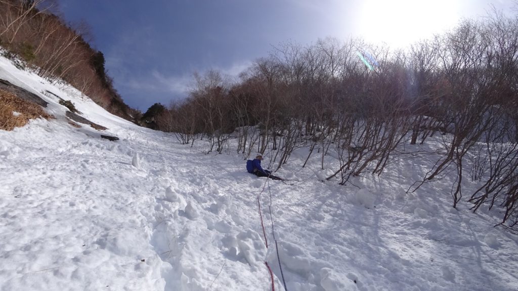 トレースをたどって、ワシの滝を通過し大町の宿に。そしてそのまま上に伸びるトレースを追ってしまい、違うルンゼに入ってしまう。左手に正面壁が見えてきてあれ違う、、。ワシの滝まで戻り、滝の左岸をトラバース、B沢に入った。ここで1時間程のロス。B沢はトレースが無く、デブリにずぼずぼ足をとられる。