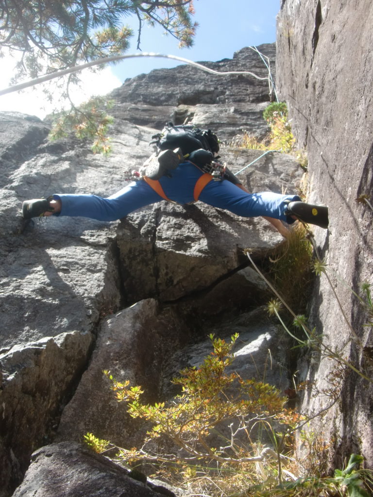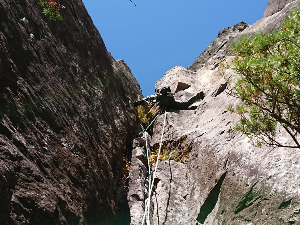 濡れていたらのっけから臆病モードに戻ってしまいそうな凹角だが、パリッパリに乾いていて快適。そして岩が硬いのも嬉しい!