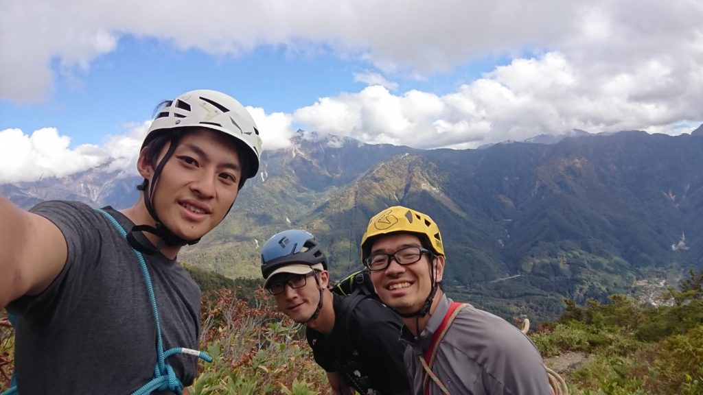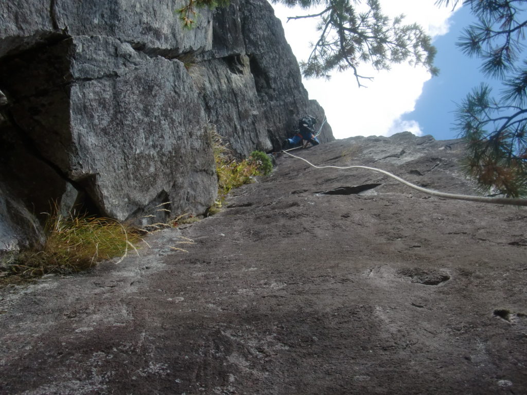 フォロー中にロープの流れで2リットルポリタンク大の落石を食らうが、たまたま下を向いていたのと飛距離が短かったのでヘルメットが凹んだだけで済んだ。岩が硬いとはいえ、アルパインの心構えは欠かせない。