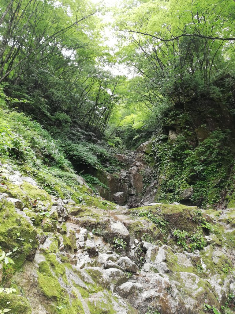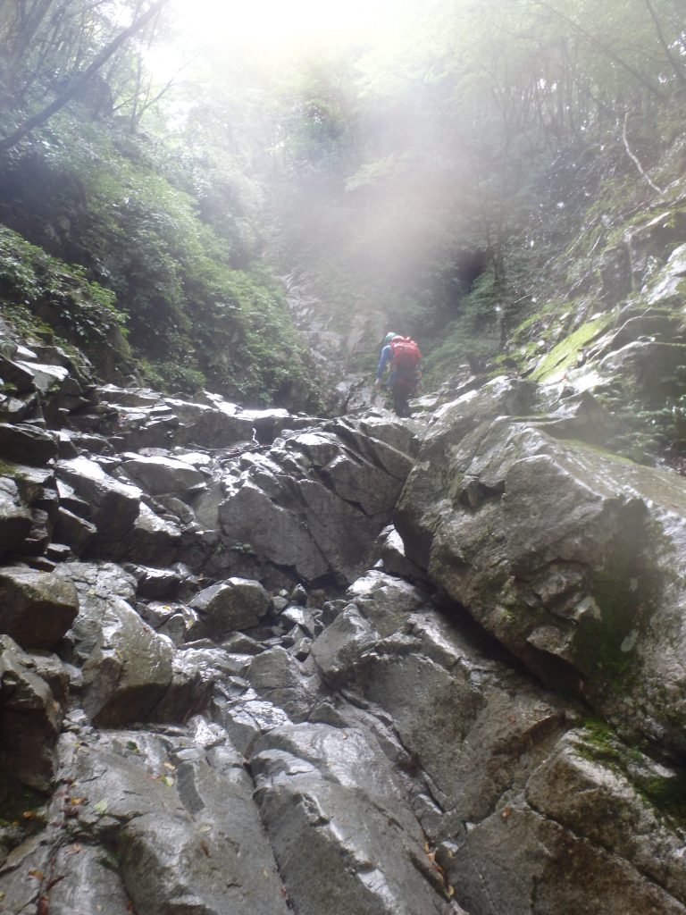 ここまではあっという間です。滝を巻き涸れ気味の沢を進むと時期に二股が現れ完全に水は涸れる今回は右沢を進みます。こちらの方が多少登攀気味なのと詰めが楽そうなのでチョイス。