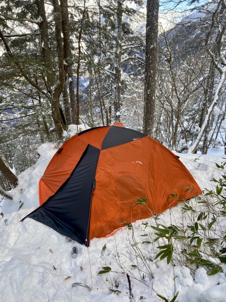 なお、今回、会で買ったばかりのファイントラックのテントをお試し使用。小さくて軽いと喜んでいたのだが、かなり寒いことが判明。中で火を焚いても寒い。冬山で使うには内張が必要だと思われる。夏山用とした方が良さそう。