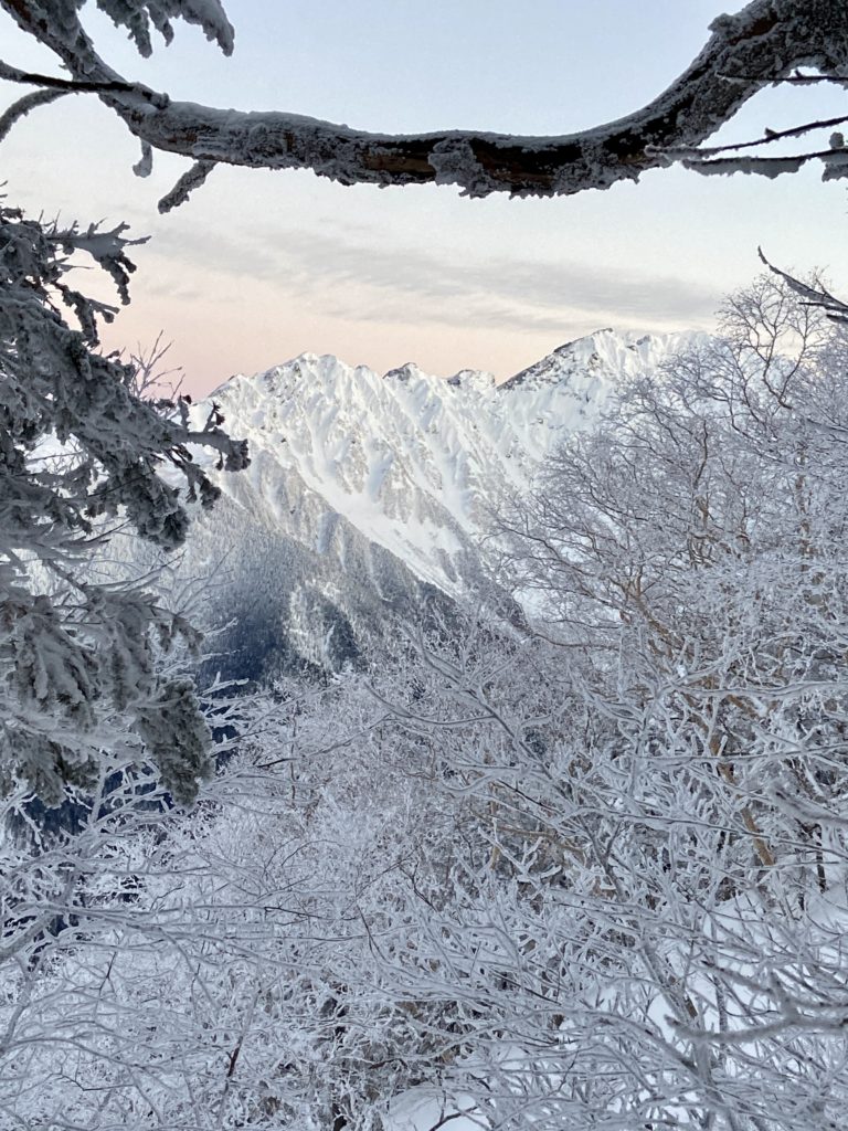 徐々に朝が明け、地平線がオレンジ色に。乗鞍岳、穂高岳、焼岳、笠ヶ岳・・・モルゲンロートに染まる山々を木々の隙間から覗きながら歩く。