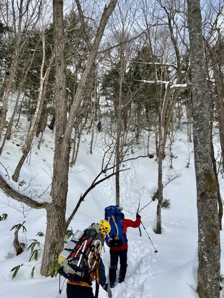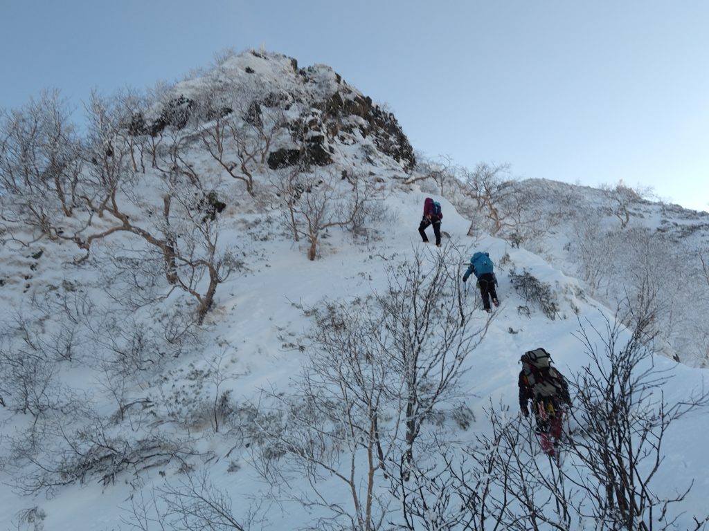 トレースを使わせてもらってツボ足で登って行ったが、途中でワカンを装着。しかし、すぐに雪が浅い急斜面になりアイゼンに履き替えることになってしまう。そしてひたすら急坂を登る。