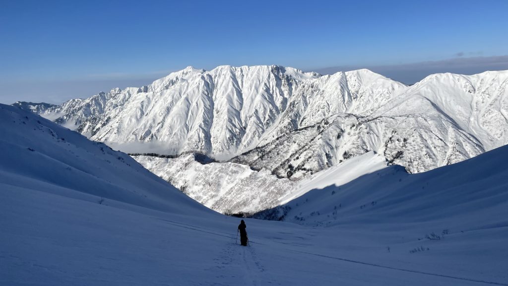 槍ヶ岳が見えた位で既に滑走していた1人とすれ違う 速すぎるぞ※K2お兄さん