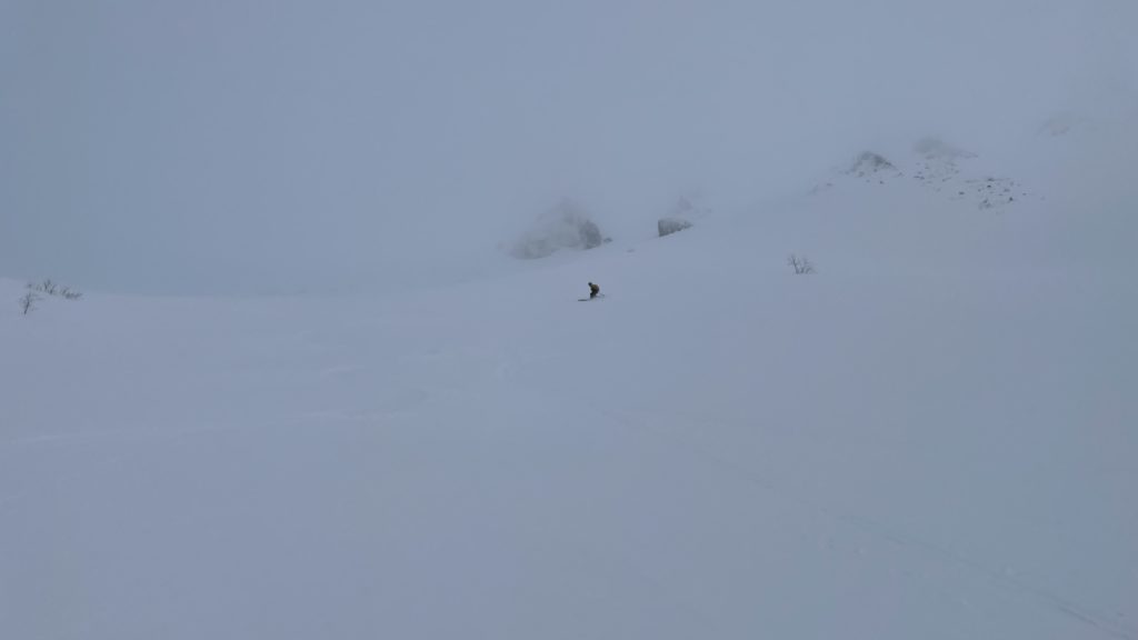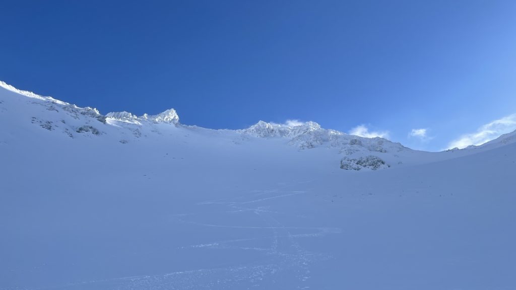 予定通りではあるが スキーアイゼンが無い板だった為途中登るのに難儀、ツボ足で登ったけど膝まで沈む雪に心折れる。影ってきて午後から曇り、雪の予報、体力と相方の滑走技術も含め計画よりも早めの10:00に引き返し判断をした。
