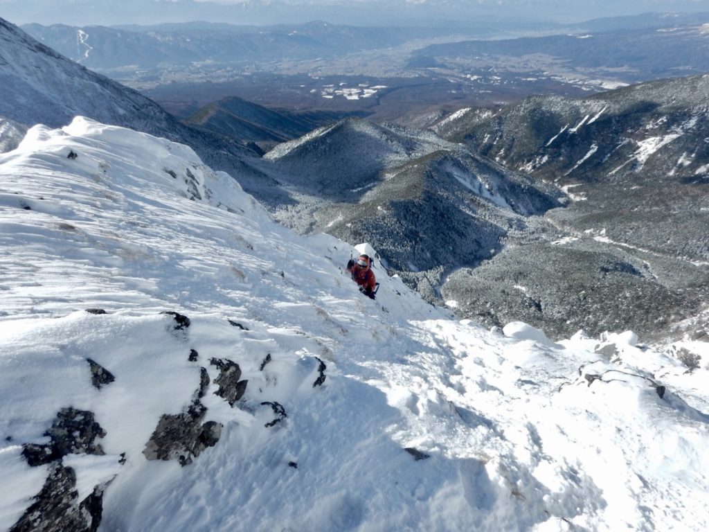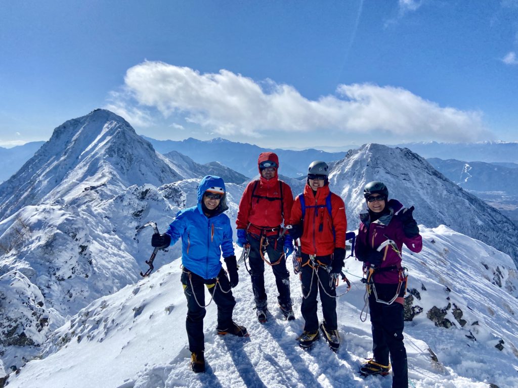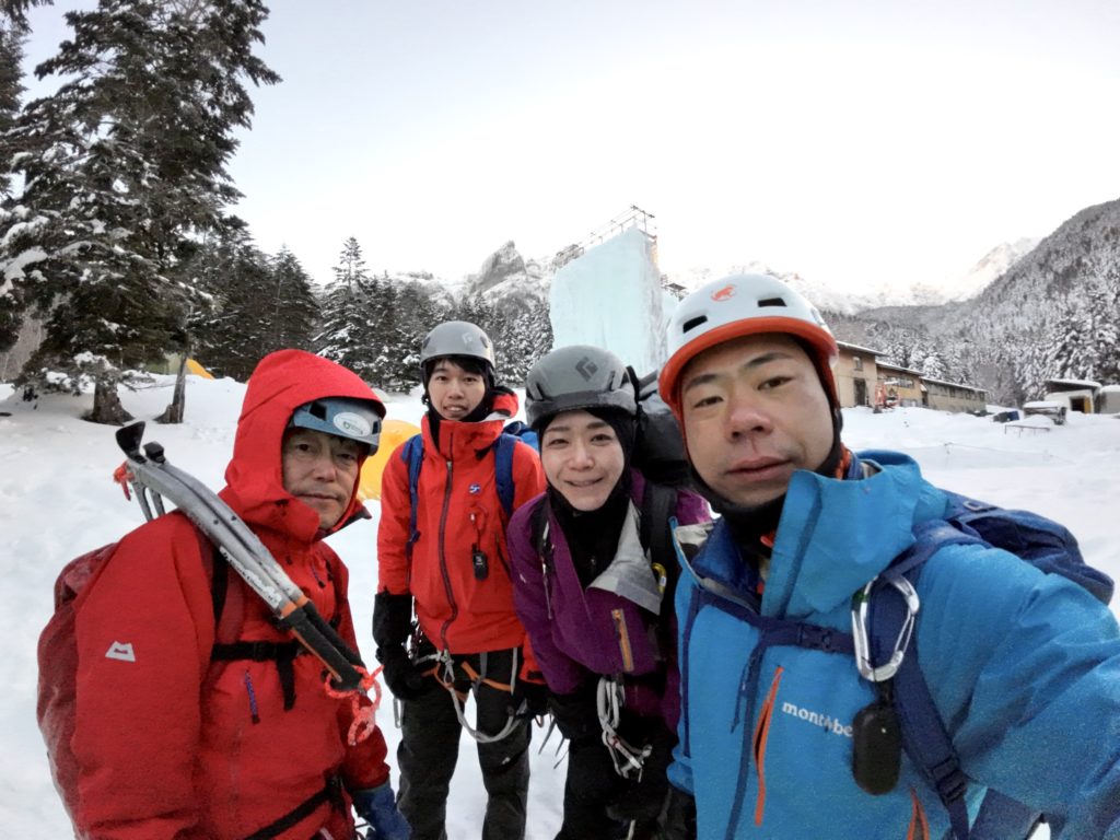 合宿2日目、寒いけど天気は良好。出発前、大善さんから行動中の注意事項など、安全に関する簡単なブリーフィングが実施される。他チームからは「こんなしっかりブリーフィングしてるの初めて見た」と言われ、安全意識の高さを垣間見る。今回は大善さんとペアなので、登りつつ色々習得できたら良いな…と思いつつ出発。