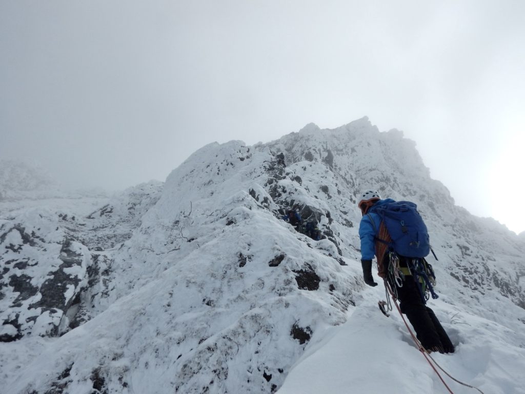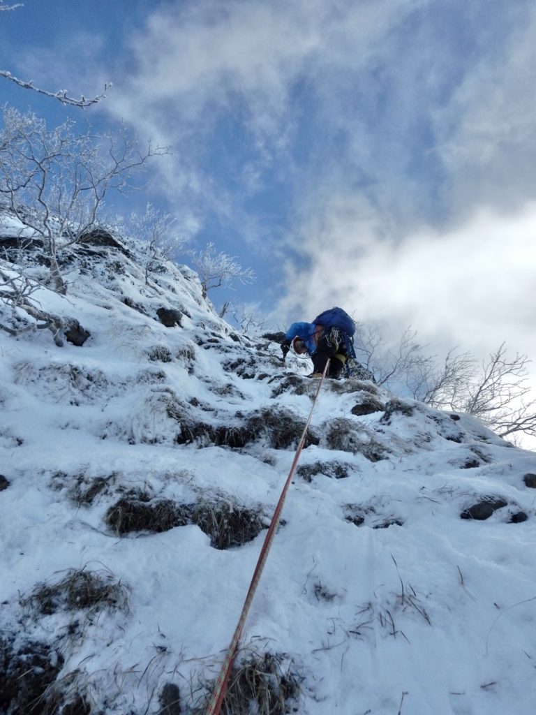 上部岩壁まではサイマル?コンテ?で進むので、ロープを胸部に巻いてコンパクトにまとめる方法を教えてもらう。10〜15回巻き巻きするだけで、腕筋不足をまたもや感じる…