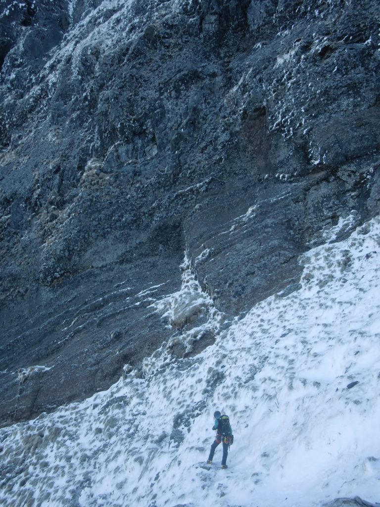 核心のハング越えには慣れないアイゼンでの人工登攀に難儀し、随分と時間を浪費してしまった。いっそのことフリーで突っ込めば良かったとさえ思った。途中、RCCボルトなどの古い終了点があるが無視して右上し、ハンガーボルトの支点で確保。