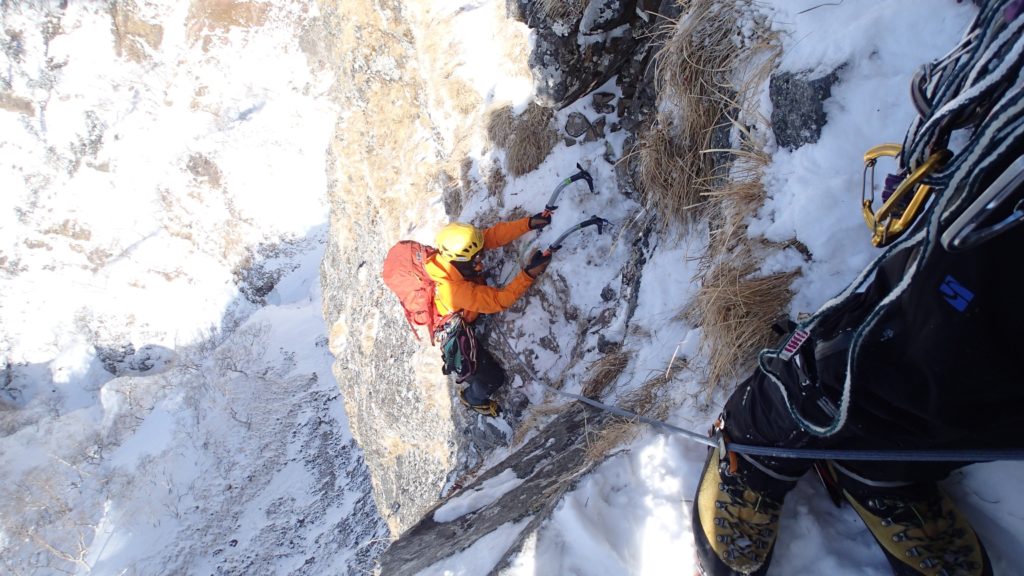 2ピッチ目。Ⅳ級/A1。mさんリード。出だしと中間にアブミが必要なセクションがある。あるいはここも卓越したアイゼン・アックスの技術があればフリーで登れるのかもしれない。