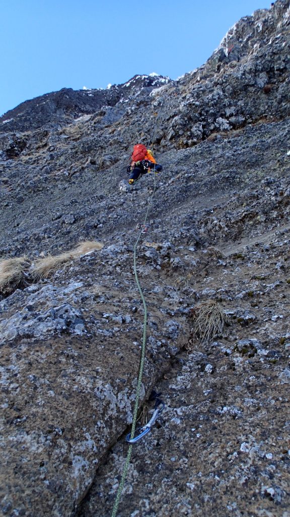 3ピッチ目。鈴木さんリード。右手のピナクルを目処に、草付きから凹角を辿る。リードは次のピッチをリンクしながら果敢に攻め、50メートルいっぱいにロープを伸ばす。1時間半にも及ぶ苦闘を見事に制してドーム基部に至った。