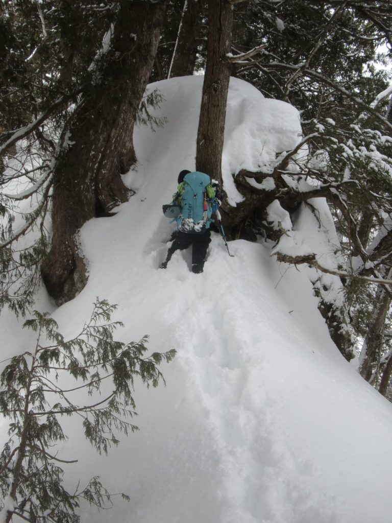 蟻の戸渡りを終えると再び鎖場。結構垂直に見えるけど・・・。しかも上の方はキノコ雪。鈴木くんは楽しそうに雪を崩していました。フォローで登るのも大変で、中々最後のキノコ雪を乗り上げられませんでした。ザックを鈴木くんに預けて・・・ようやく登れたーー!