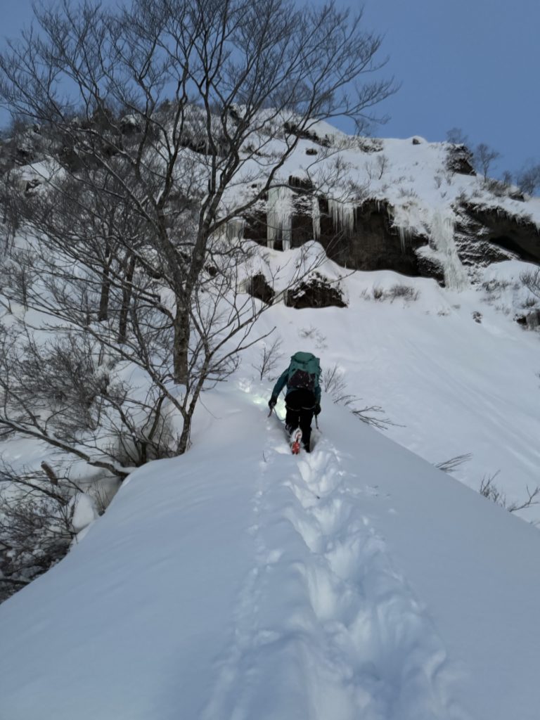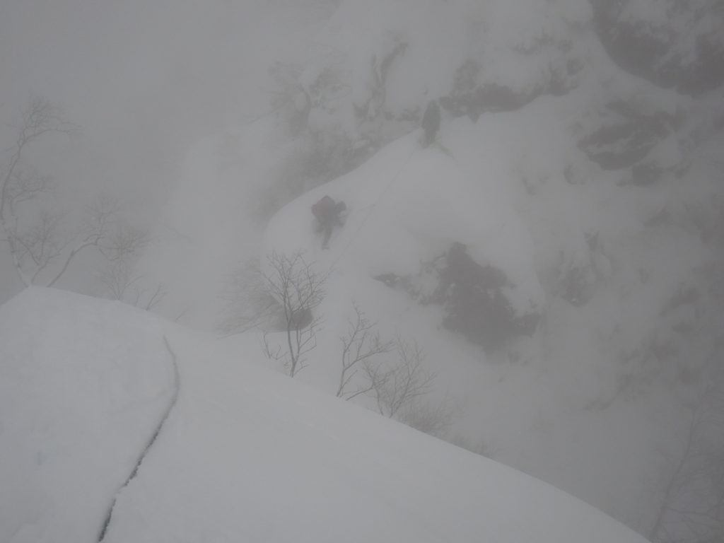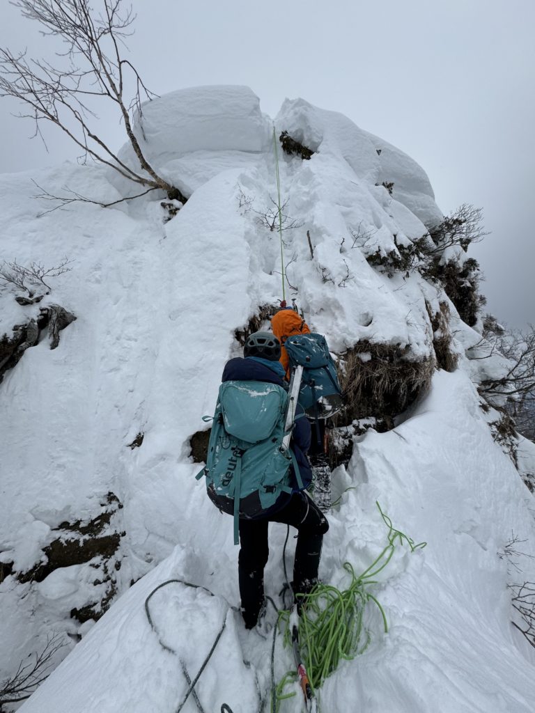 2日目は鈴木くんの猛ラッセルで進む。みかさんはスリングを使って胸と腰に簡易ハーネスを作っていました。一歩ごとにピッケルを奥まで刺して、ズルってなっても落ちないようにして歩く。細いルンゼ?からロープを出す。