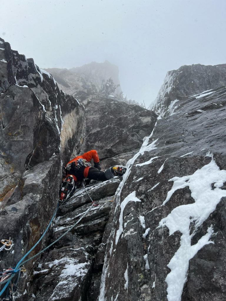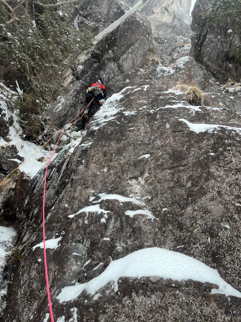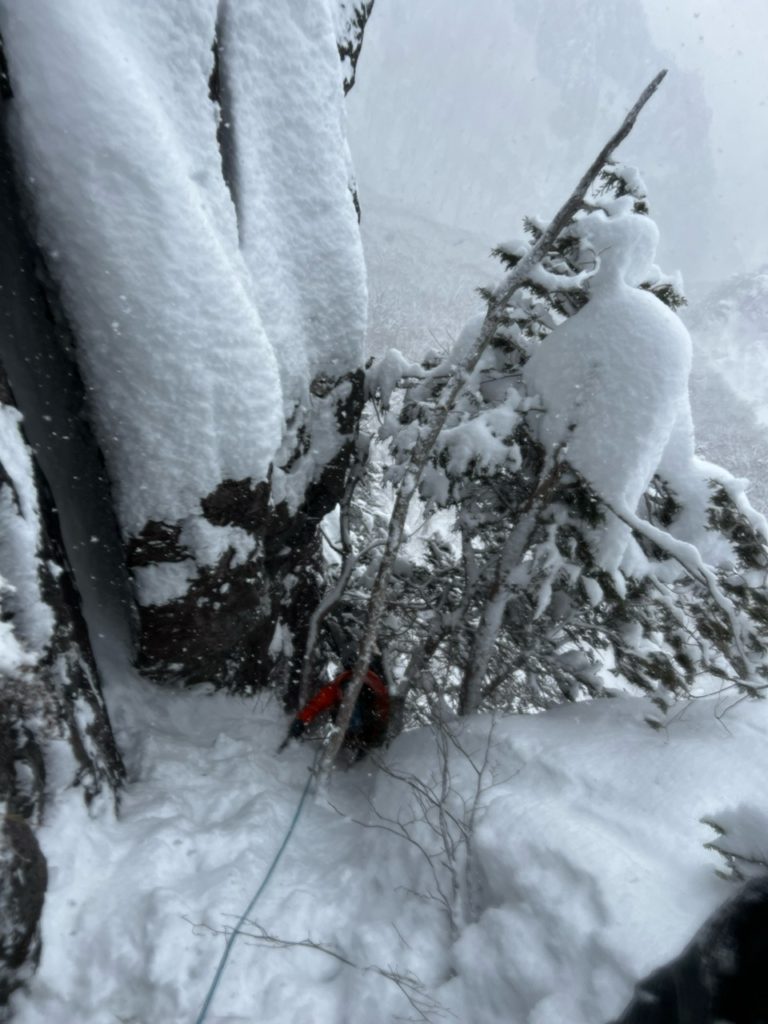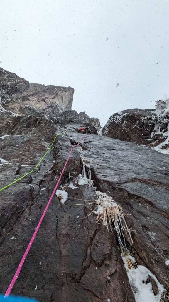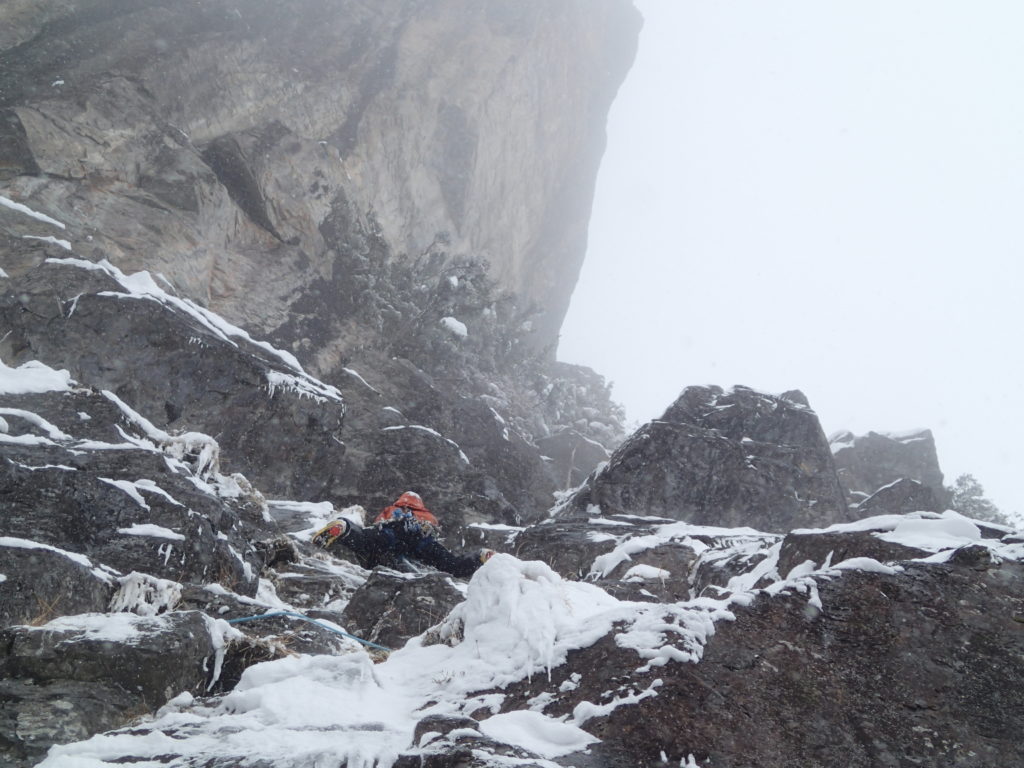スタンスやプロテクションは割とポジティブだが、今回は着雪が多く、探すのが大変でした。トライカムとイボイノシシが有効に感じた。全体的にほぼフッキングのみで登った。草付き凍ってなかったら厳しいのでは。