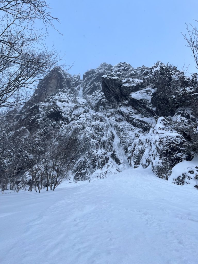 左シリーズ二日目。私にとっては今年に入って7日目の錫杖。前夜から30〜40センチほど降雪があったようで、壁にも多量の湿った雪がこびり付いていることは自明の理。今日も時間かかりそうだなと朝イチからひらゆの森の営業時間が気になる。