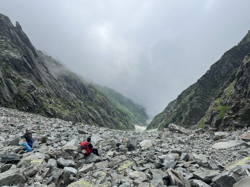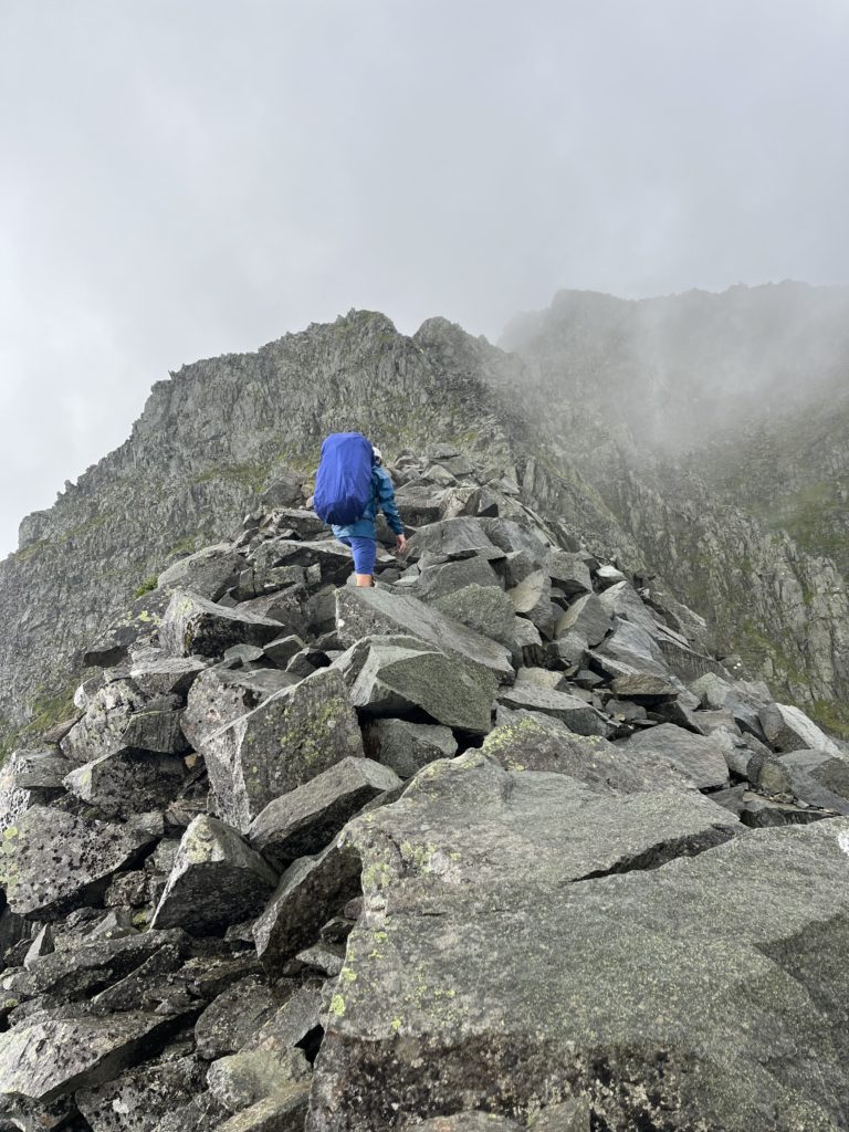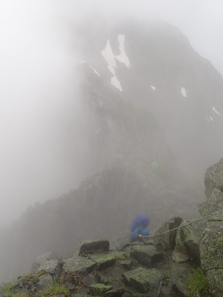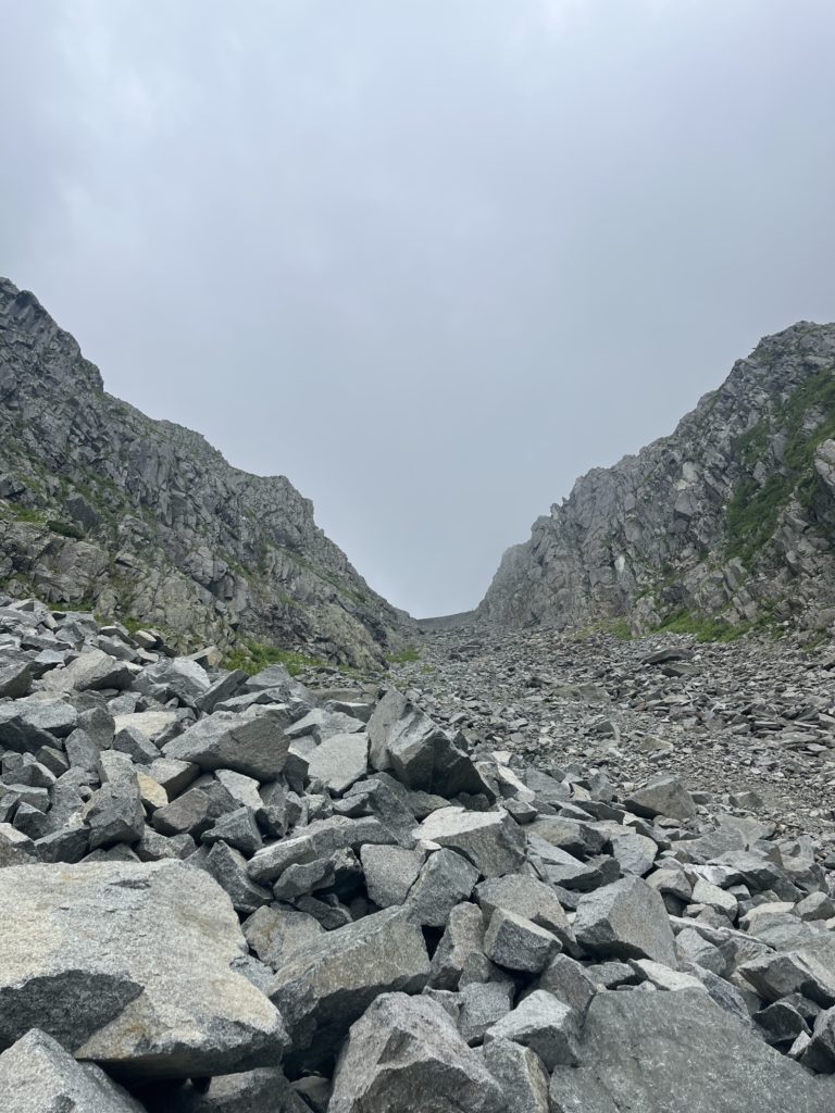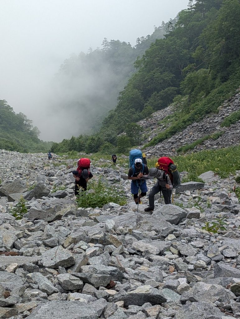 ガレ場が始まってしばらくしても、意外とメンズ勢のペースが上がっていないように見えたが、錯覚だった。山荘のあるコルがガスの切れ目から見えても一向に近づかない。