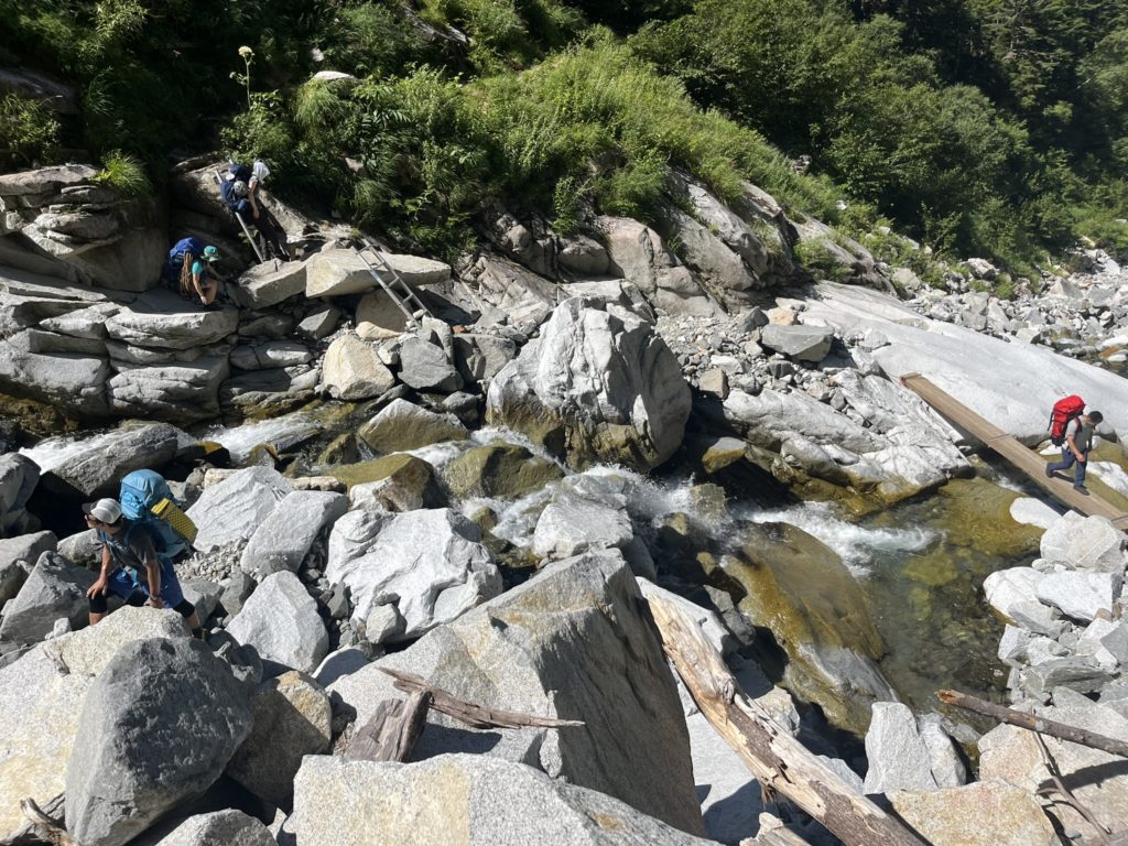 悪い登山道から2回目の渡渉で水を汲み、穂高岳山荘への登りに備えた。