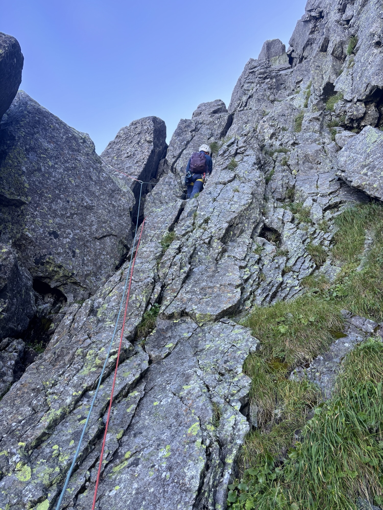 1ピッチ目を探して進むが、目の前のチムニーはワイドすぎたので、横壁をフリーで登ると終了点らしきロープ見えたので、少し下がって登攀を開始。すると、チムニー奥に残カムが2個が見えた。