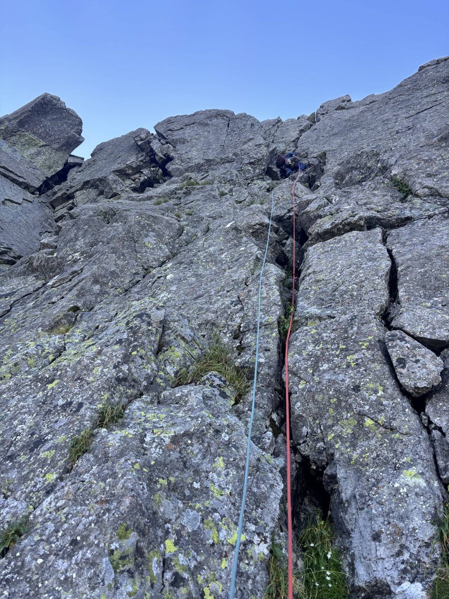 2ピッチ目こそトポ通りのルートを進みたいところだが…あれれ?大善さん、そっちに行っちゃうの?そこから左上で左のスラブ行くんじゃないの??と聞くも、こっちもハーケンだらけでどこでも登れる!と…… 面白そうならルートなら良いけど…と思いつつ、ついていくしかない。