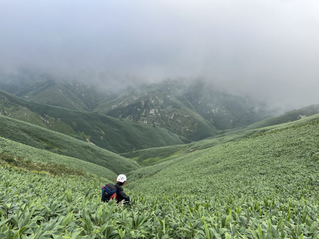 そして稜線までの詰めが悪かった。滑り落ちて行きそうな草付き?草原?ふくらはぎ集中のかろうじて時々出てくる岩を繋げてやっとの思いで稜線にでる。反対側には赤谷川本谷が広がる。