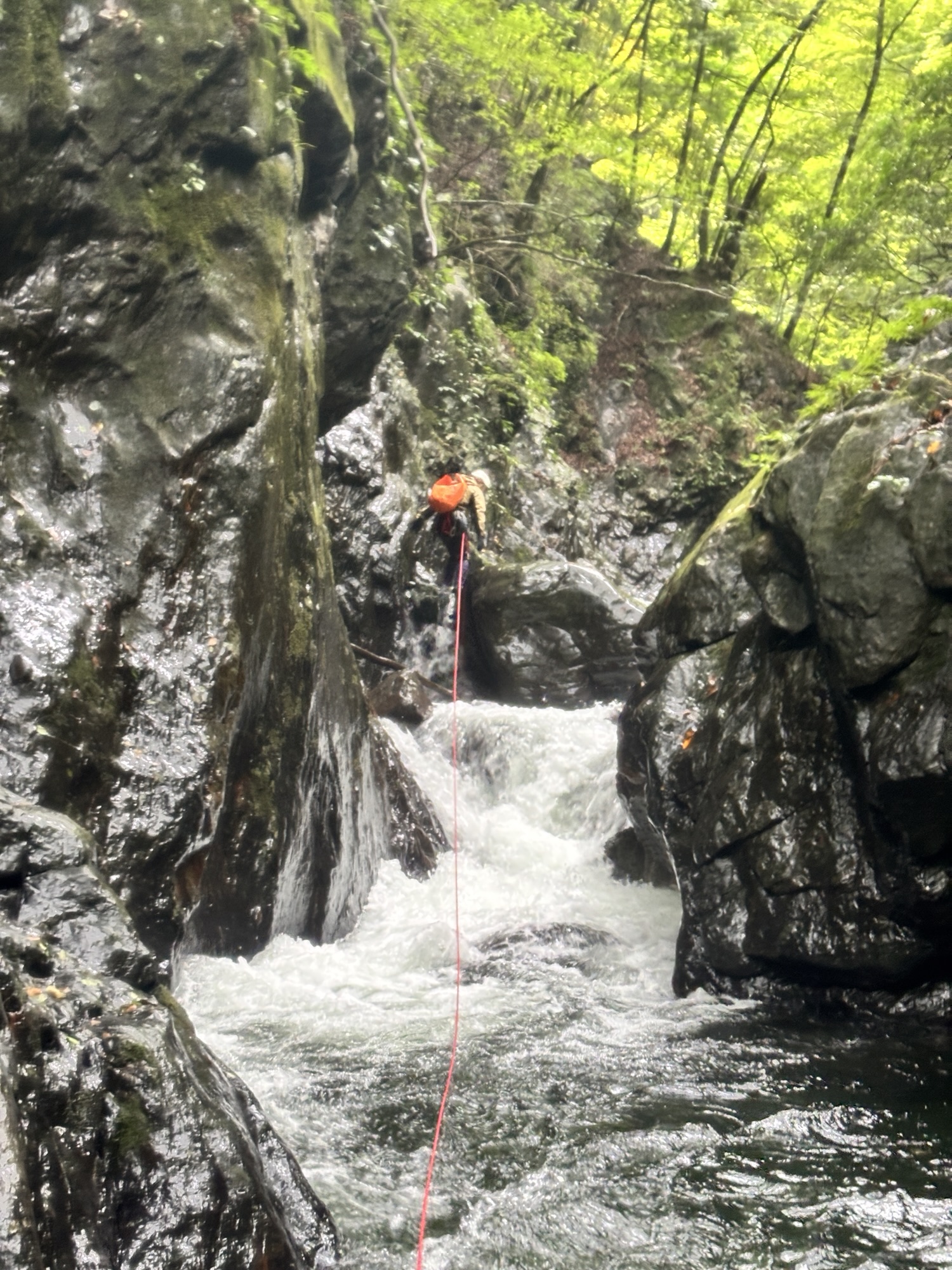 5:30に茅ヶ崎を出発したが、嫌悪移動が渋滞。天気が悪くても三連休初日は侮ってはいけなかった。結局小金沢公園を出発したのは、8:20となった。林道を1時間程度歩き、前回の待避所10番あたりから下降点を探すが当たりは急で高い。別のパーティで9番というのがあったので、マシそうなとこから下降するが結局懸垂した。降りたら下降に良さそうな沢があった。多分8-9番の間くらい。ここでも思いの外時間をかけてしまった。