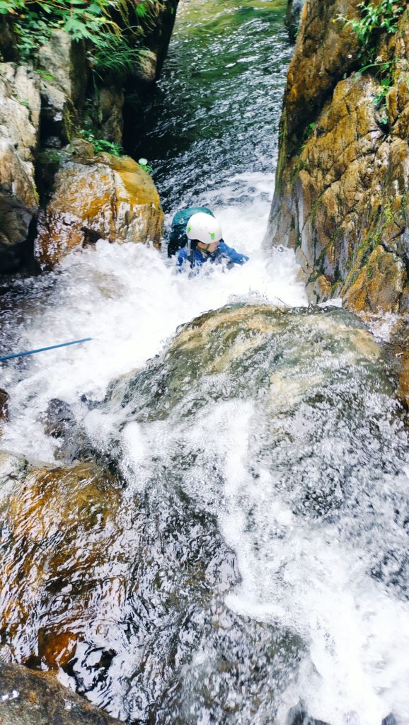 少し歩けば最初の核心の小滝と淵。ここは山の師匠のつかさんが左から悪いへつりを突破してくれました。後続の私はへつりと飛び込み、新人・中橋さんも果敢に水と戯れる!