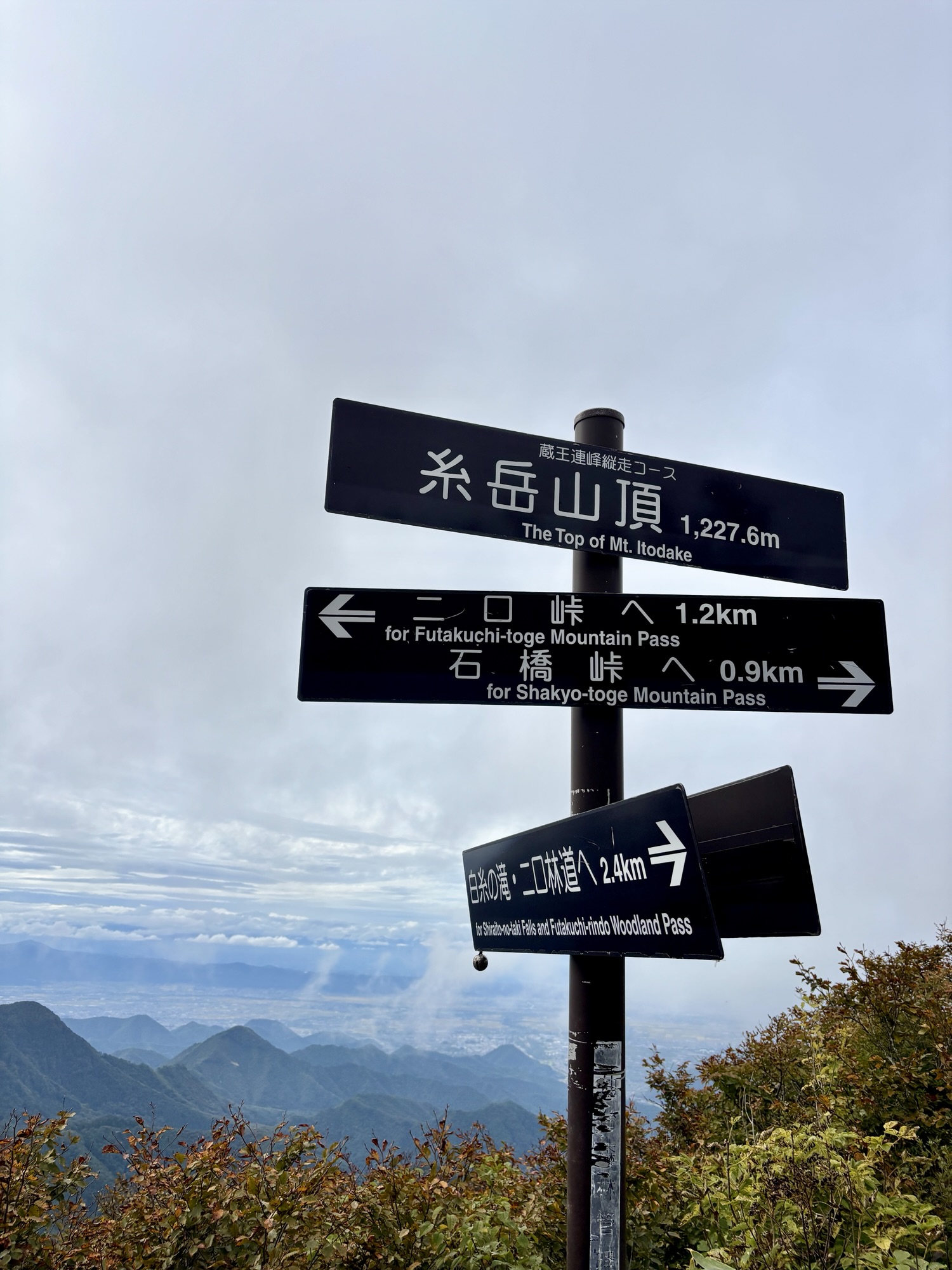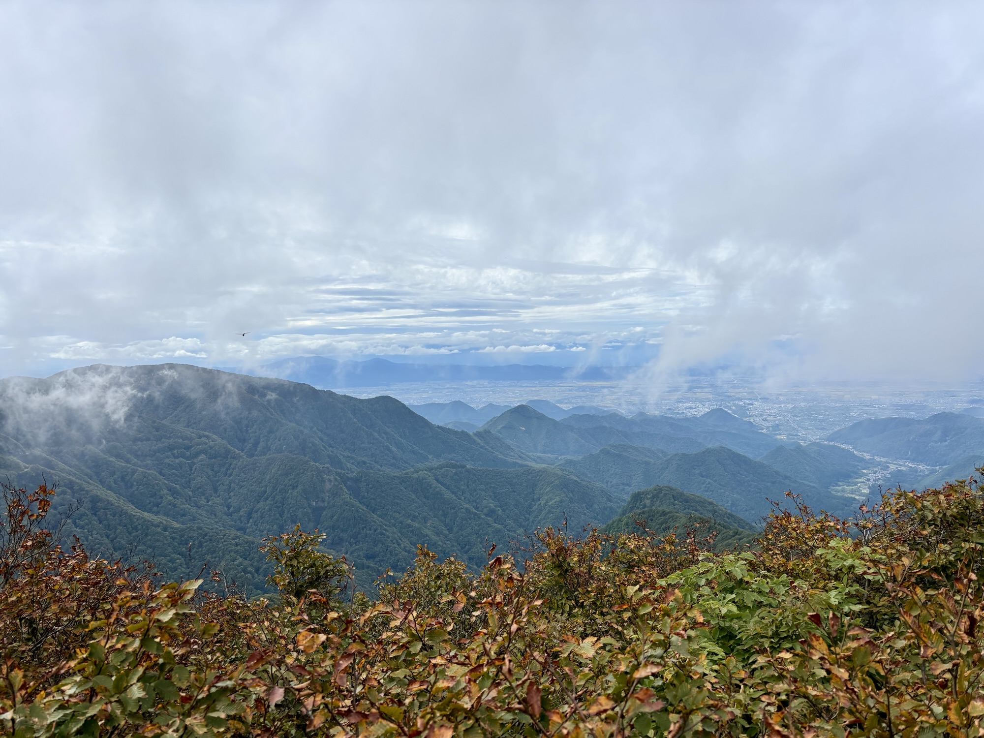 北石橋の滝を超えたら脱渓。糸岳に向けてひたすら尾根直登。霧で特に景色もなく、途中からはトレースもあまりない藪漕ぎ状態でほぼ無言歩きだったけれど、山頂到着した時は周囲のガスが抜け、天童市方面の景色を見ることができました。