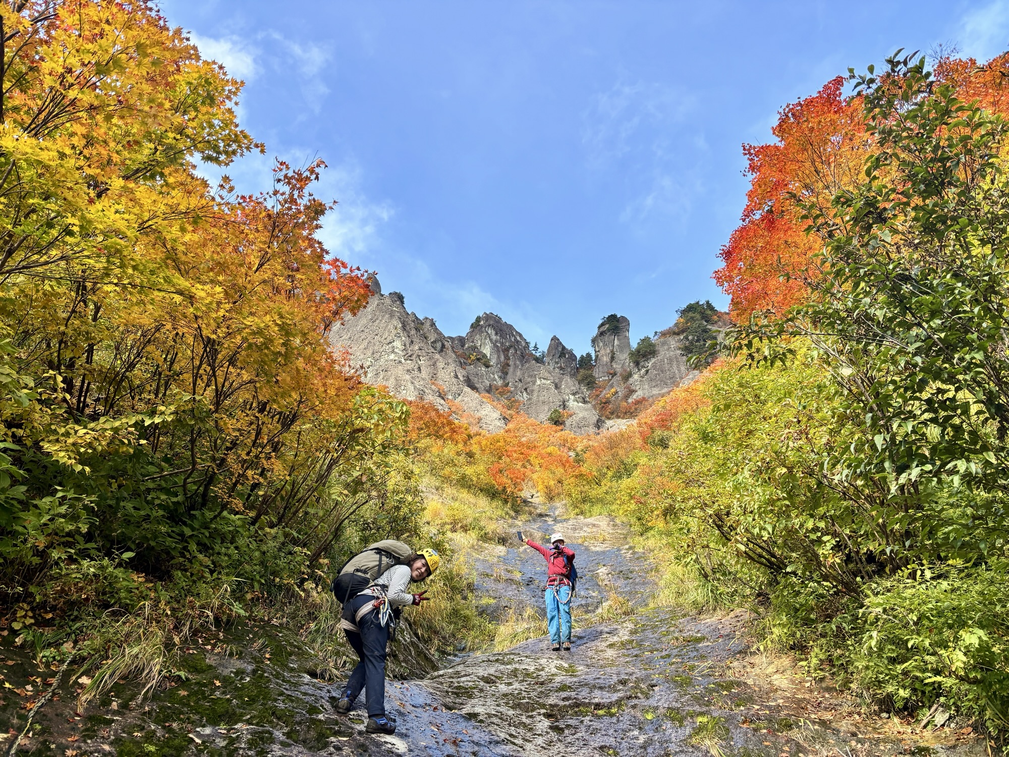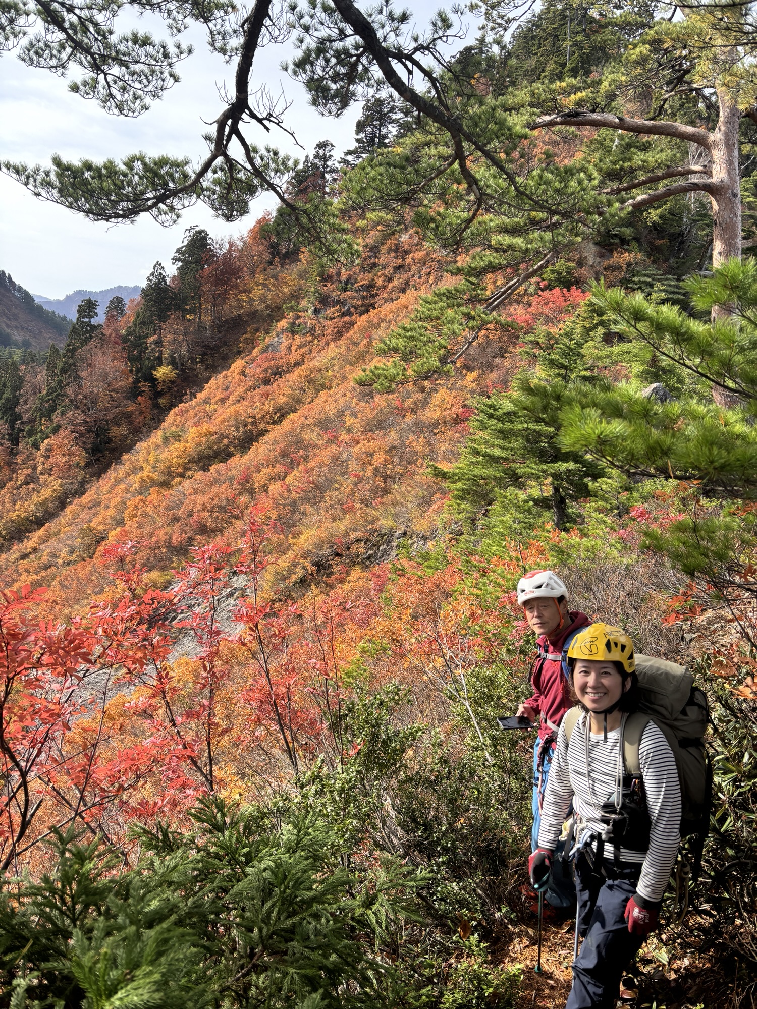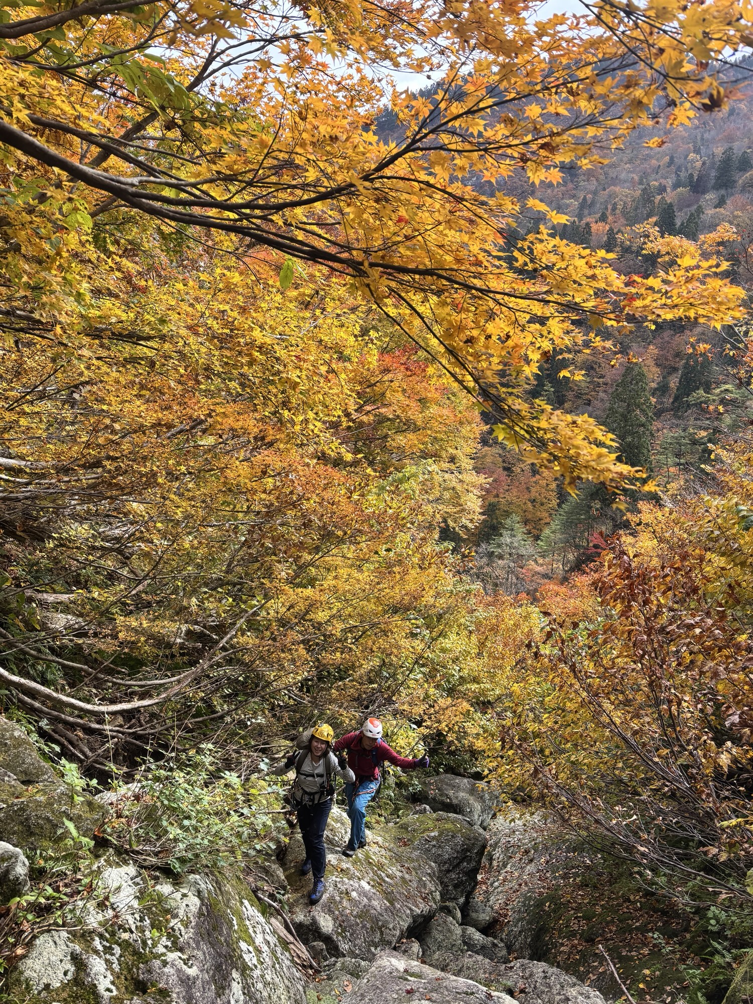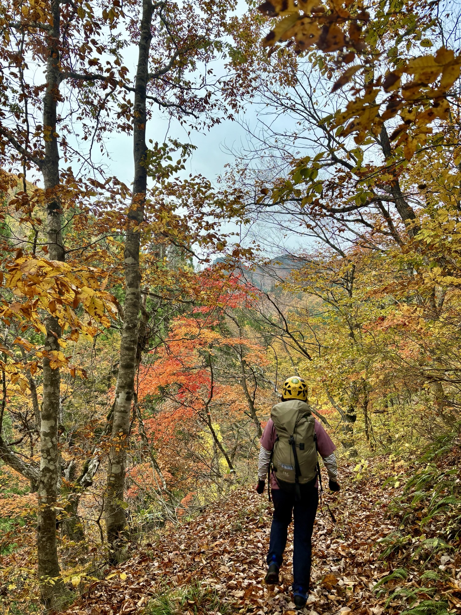 登山口〜シジミ沢までは樹林帯歩き、道は明瞭だけど、前日の雨のせいかぬかるみで滑りやすい上に落ち葉いっぱい。途中からは標高も上がり、沢登りの高巻きをしている感じで、全く気が抜けないが、すぐ横には岩壁と紅葉がいい感じに時々見える。