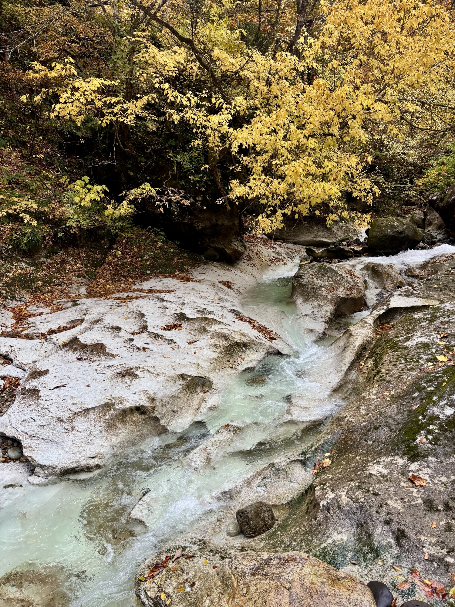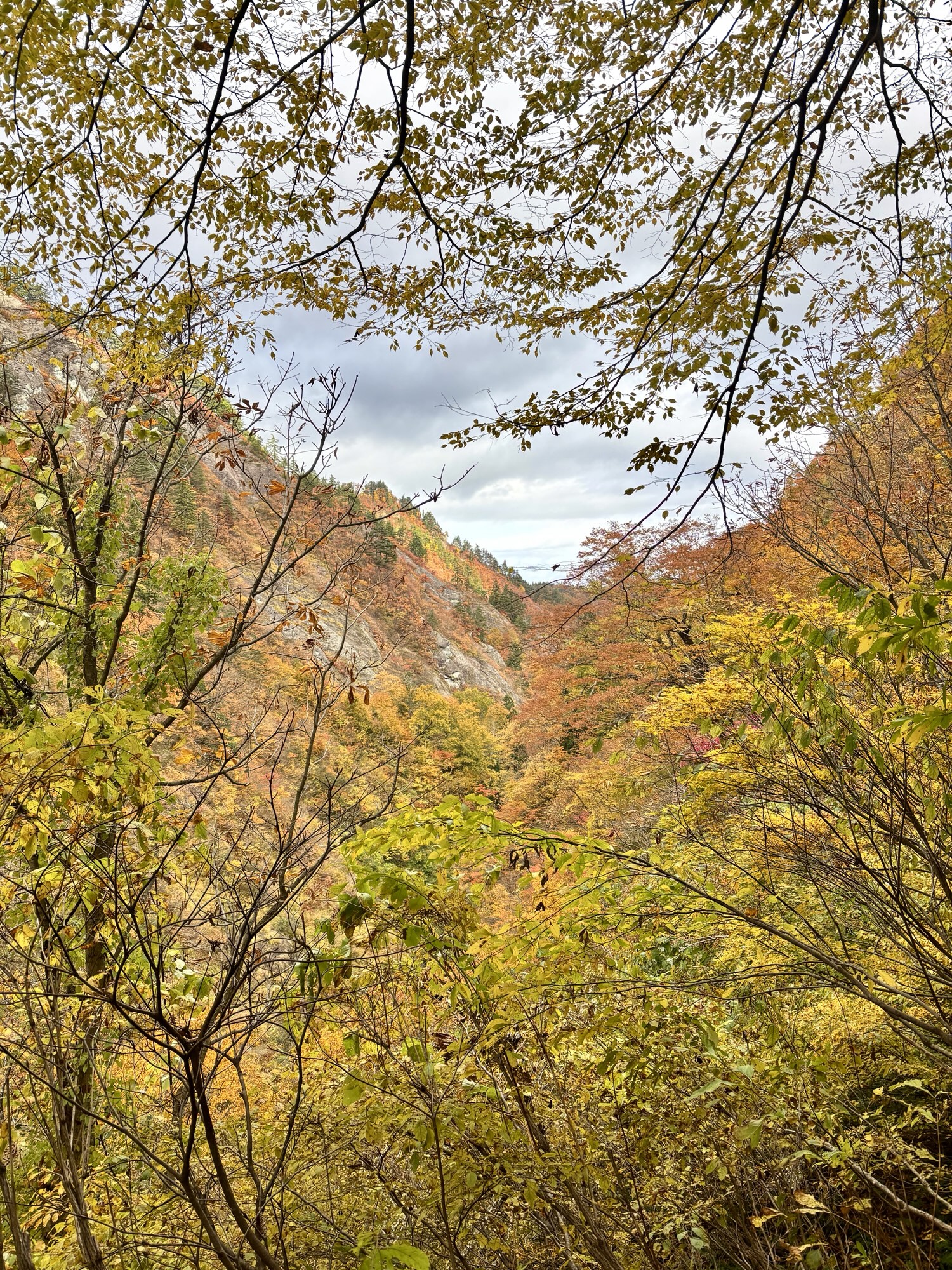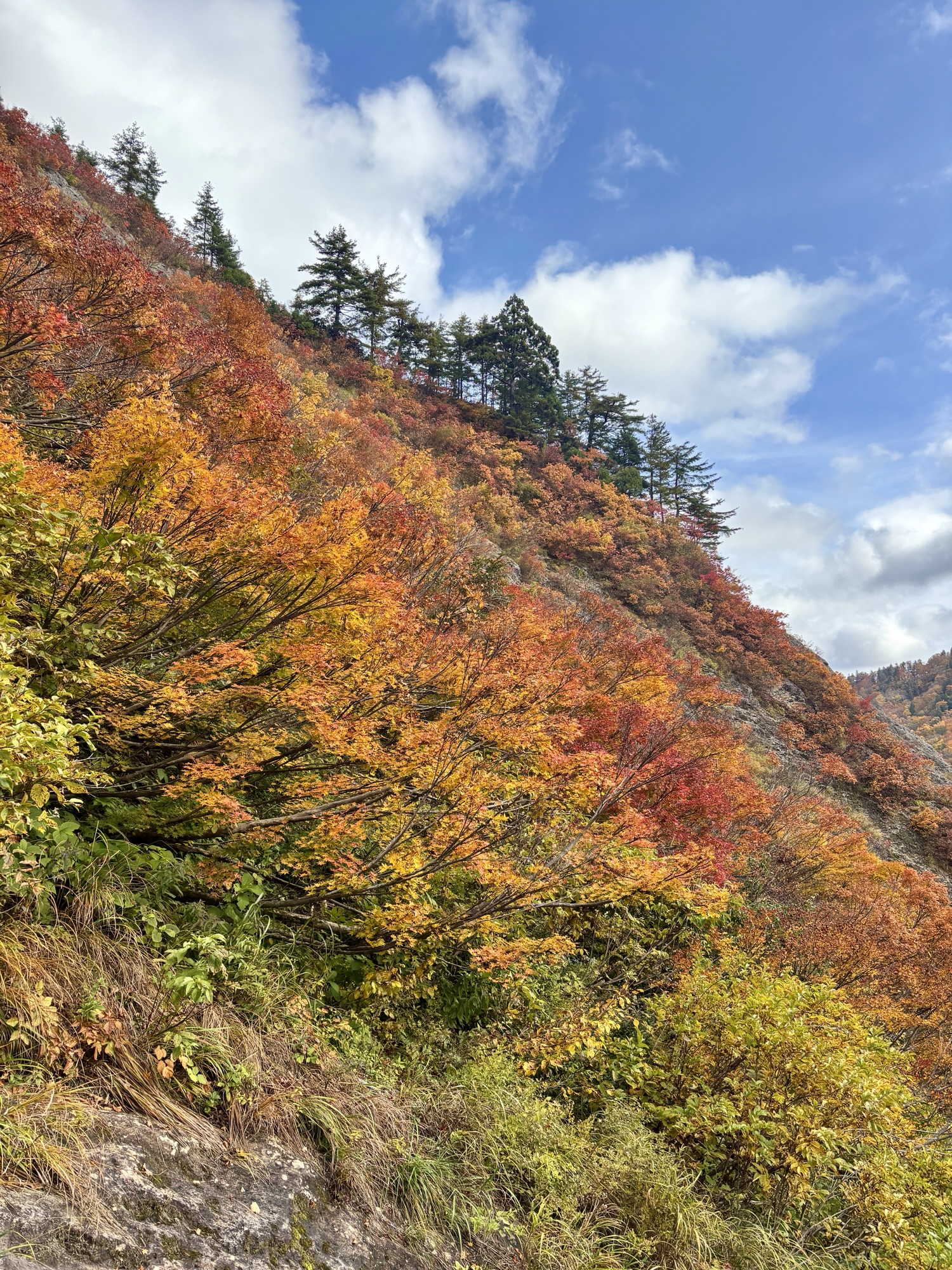 それと共に正面からどんどん青空広がってきて、周辺の紅葉の色がどんどん鮮やかになってくる、最高!!
