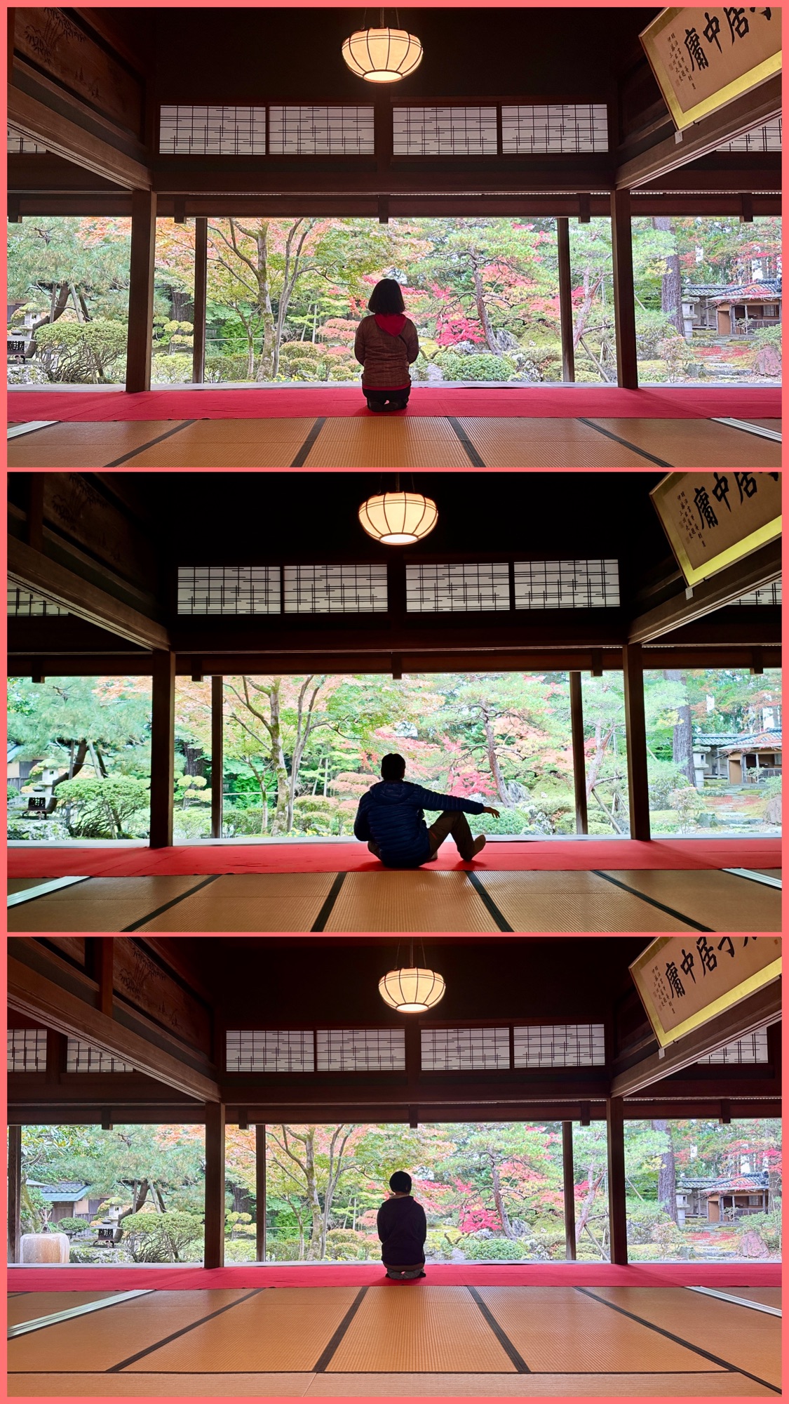 スタスタ進みすぎ、先行パーティに追いついてしまったので、眺めの良い&座っていられる場所を見つけて、絶景紅葉鑑賞タイム。